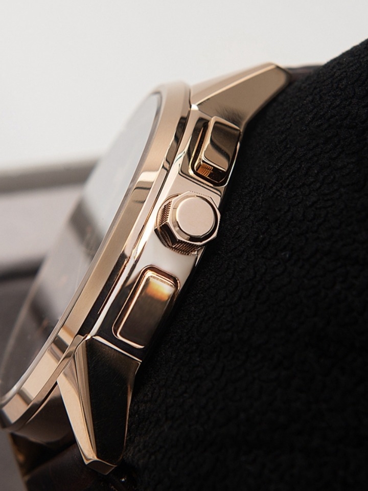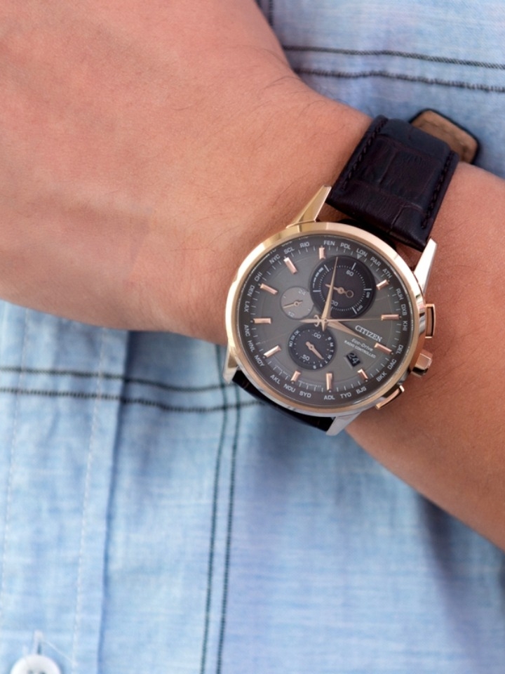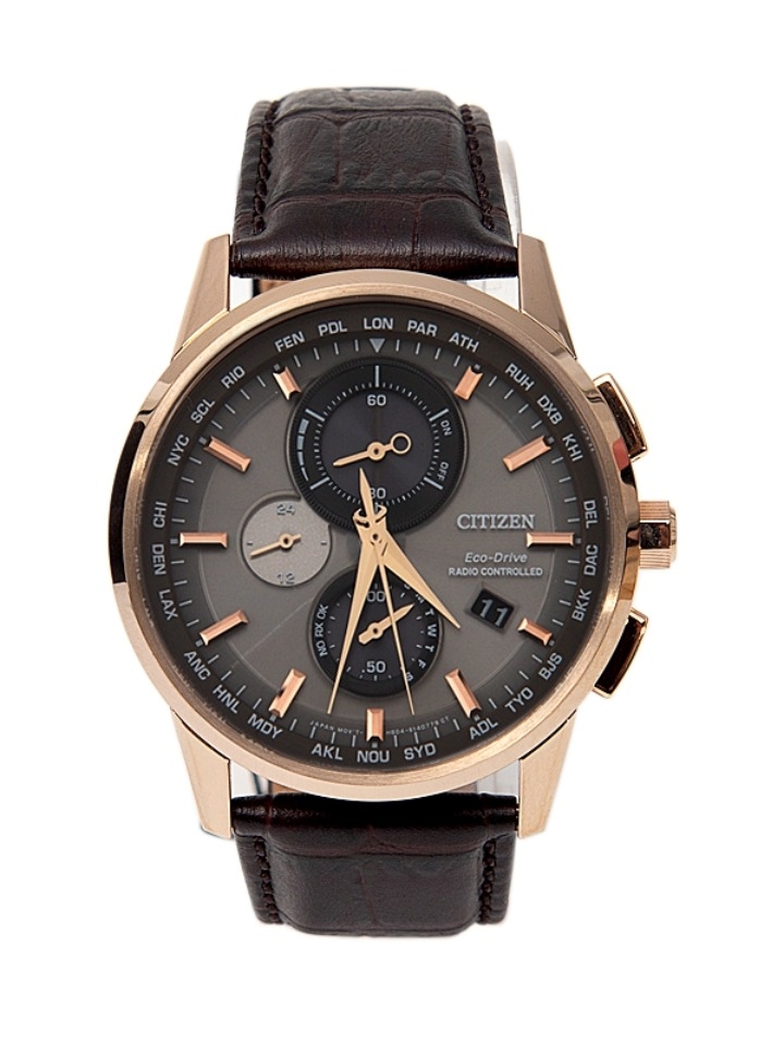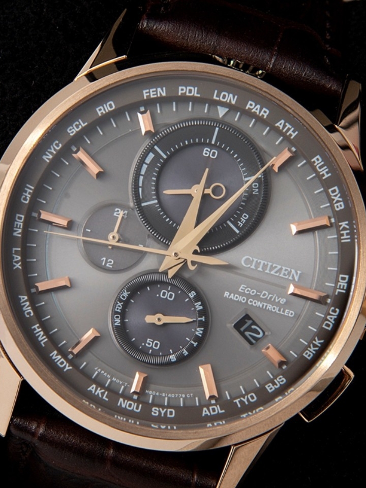 自1930年成立以来,西铁城(Citizen)就一直秉承多元文化的理念,坚持不懈地追求卓越、致力创新。此款腕表采用镀玫瑰金表壳搭配黑色皮制表带。双眼设计,并具有24小时时间、本地时间,星期与剩余电量,万年历,3点钟位置显示日期,并搭载了Eco-Drive H820机芯系统,遇可见光就可转化。大气优雅而有韵味
