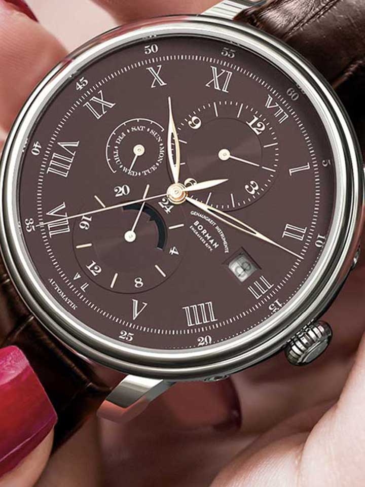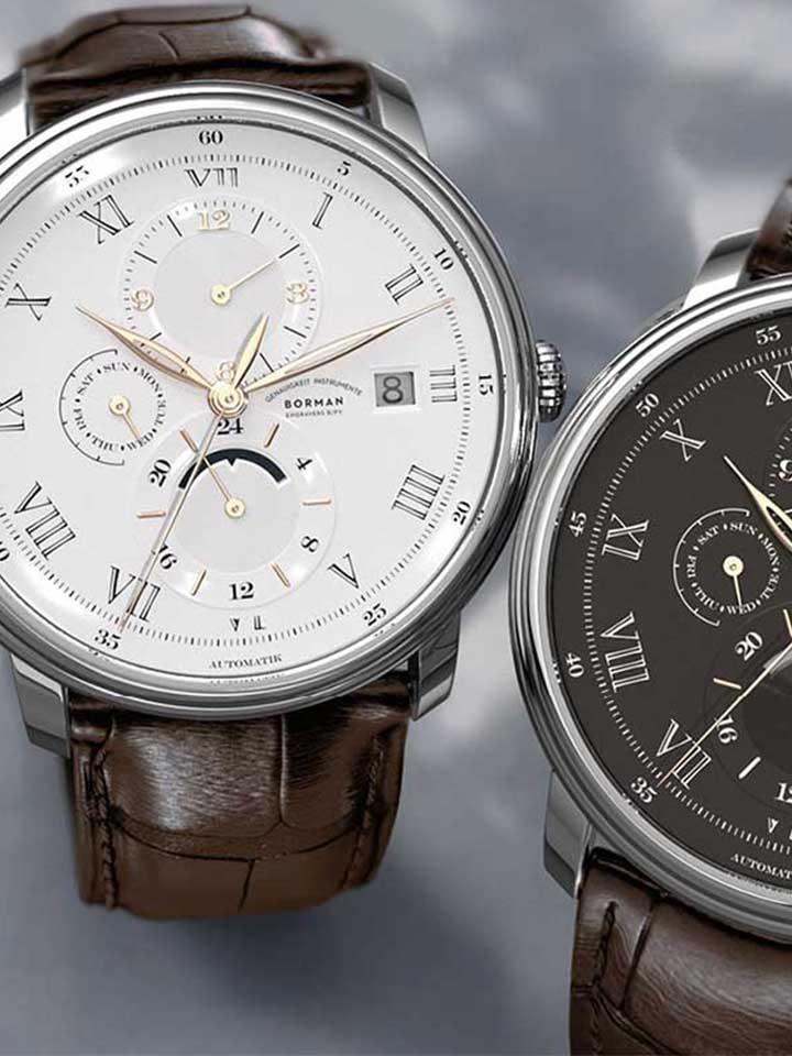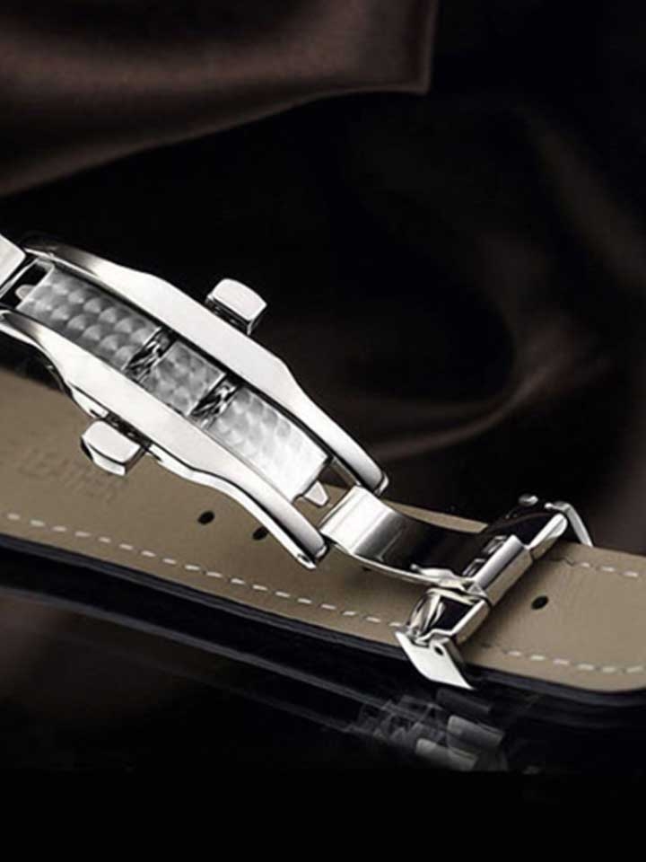 采用头层小牛皮标准定制表带(内有定型填充物),透气吸汗,定n型后佩戴柔软妥帖。精钢材质蝴蝶双按扣,开合处打磨精美纹理。