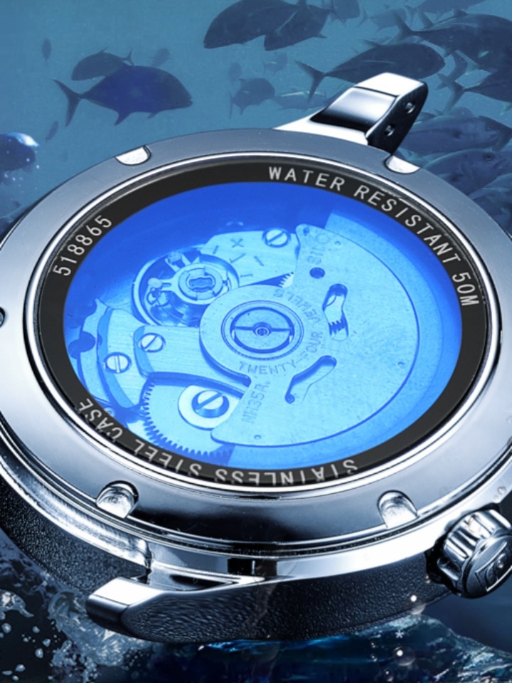 帅气的黑色钢带男士手表,独特的纹理表盘设计,是以油压纹和CD纹拼接而成,两种纹理在手表中间柔和过度,让表面的层次观感更丰富立体。手表背面采用的时髦的透底设计,只要翻转手表就可以清晰看到机芯运转,更显不俗品质。