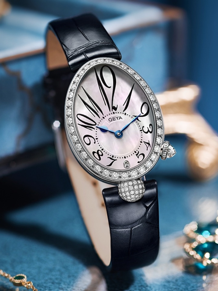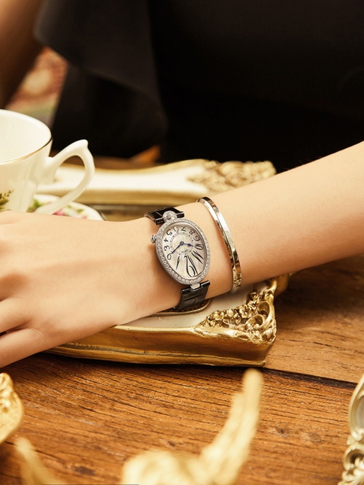 椭圆形的表盘尽显独特设计风格。偏心刻度环的设计十分精妙。表盘镶钻设计,尽显品位。