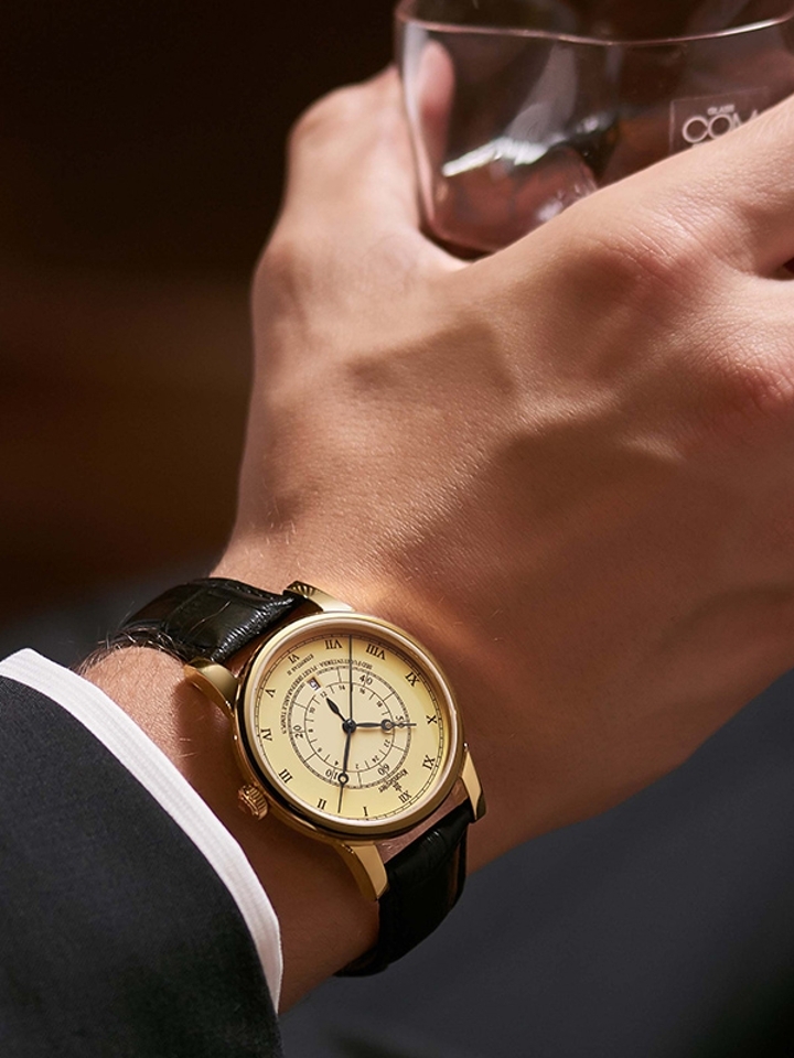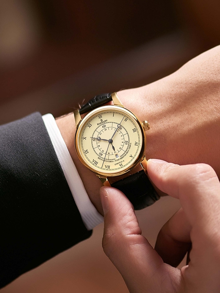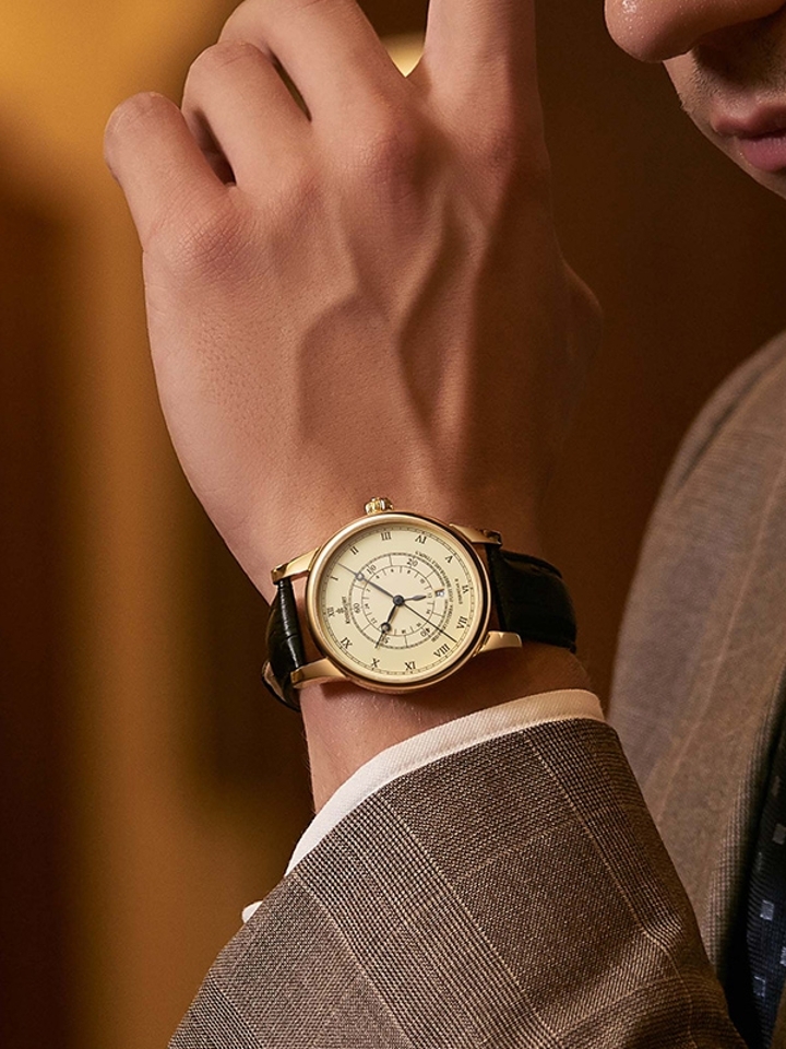 采用德国原装石英机芯;金色的表壳配上米色表盘,罗马数字刻度更是显得复古风十足,内圈镌刻拉丁语诗句铭文,意为“时光飞逝不再来”,时光无价,当惜之如命;拥有GMT第二时区显示以及日历显示功能,满足使用性需求。