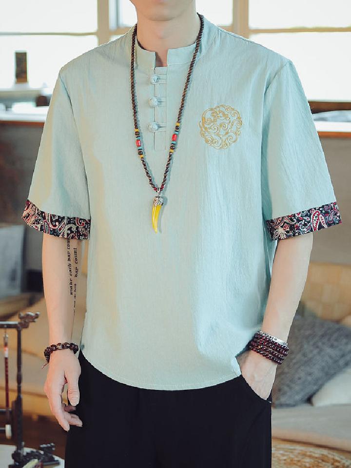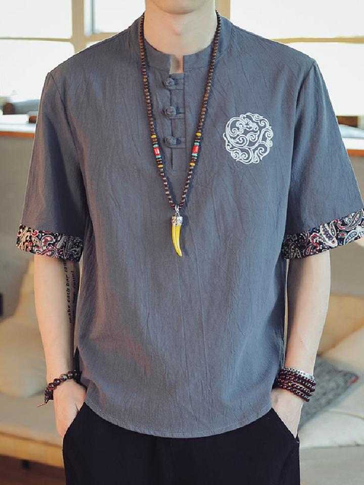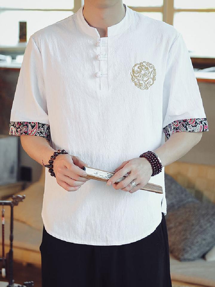 此款中国风男士棉麻短袖T恤宽松立体,纯色打造经典时尚,领口一粒扣设计最为亮眼,新颖独特,盘扣与精致的天然果实扣相结合,是传统与现代的完美融合,满足了人们的怀旧情怀。