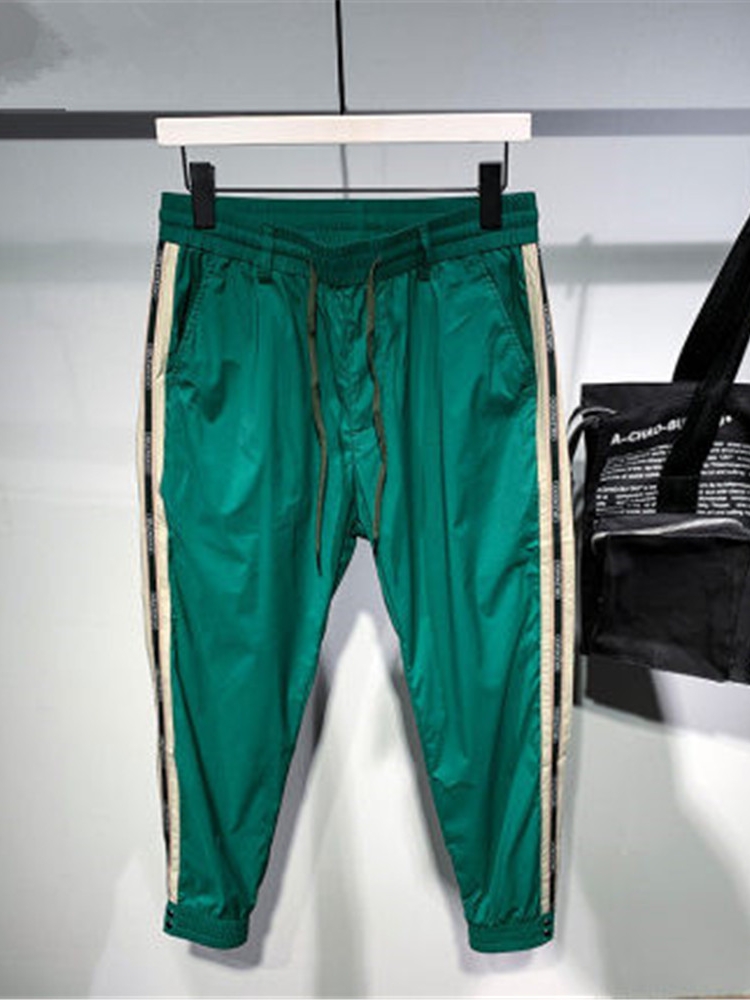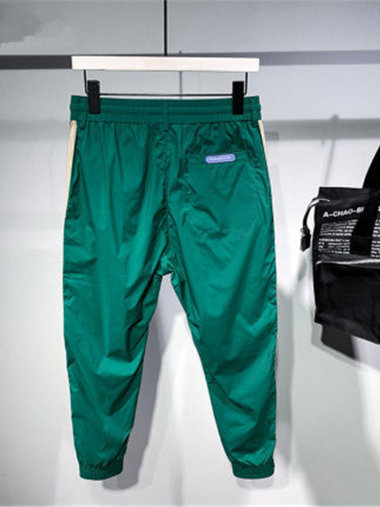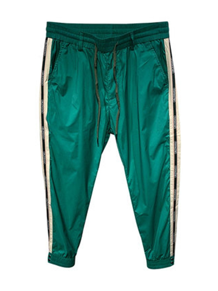 采用了裤腿收口的设计,上身显干净利落。宽松的裤腿能很好的修饰腿型。撞色条纹装饰裤身,给整体增加了时尚亮点。鲜艳明亮的色彩,是时尚型男们秀潮酷个性的百搭单品。