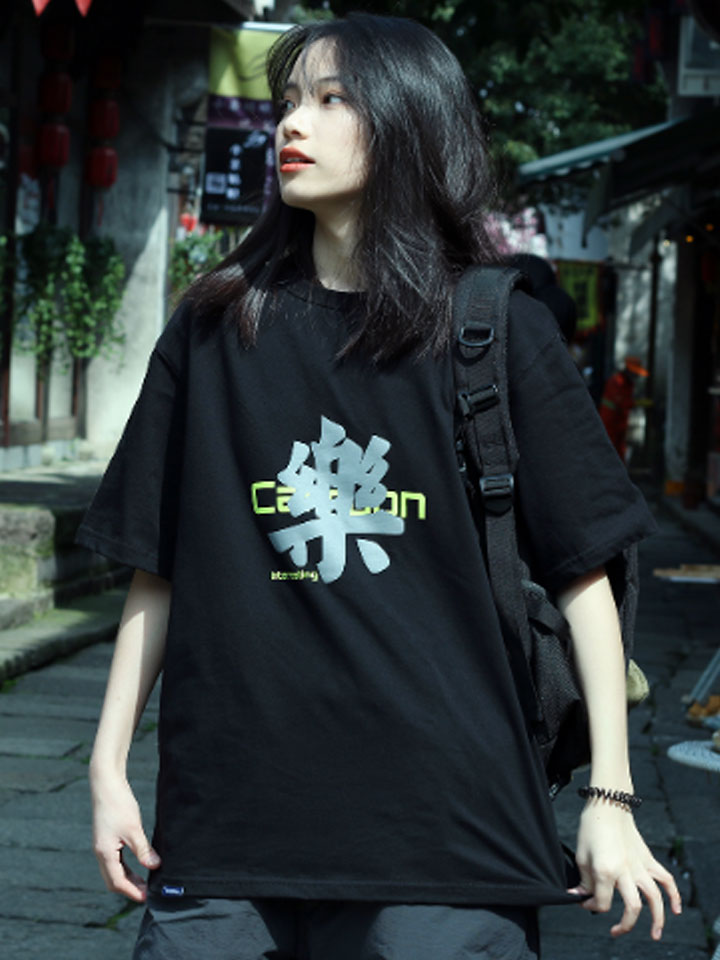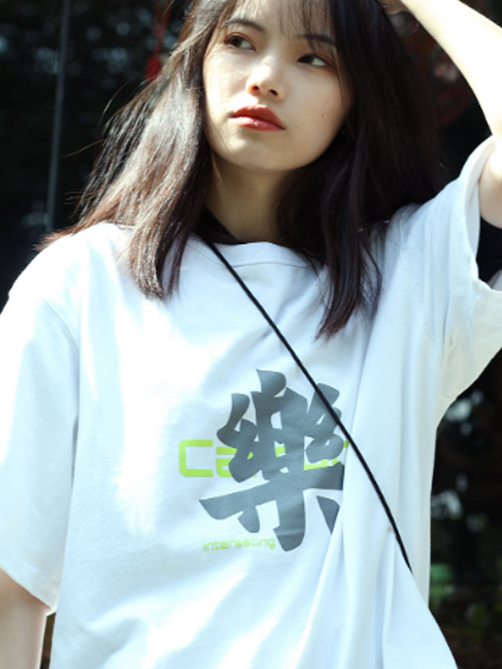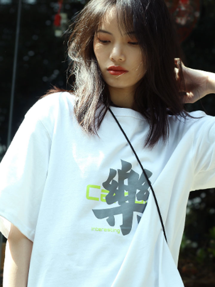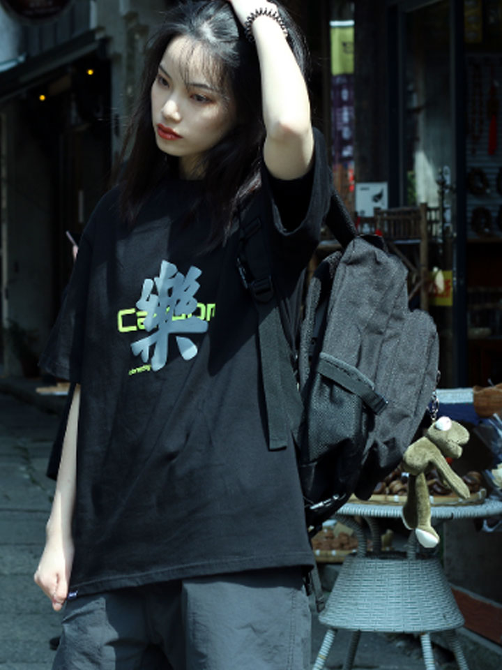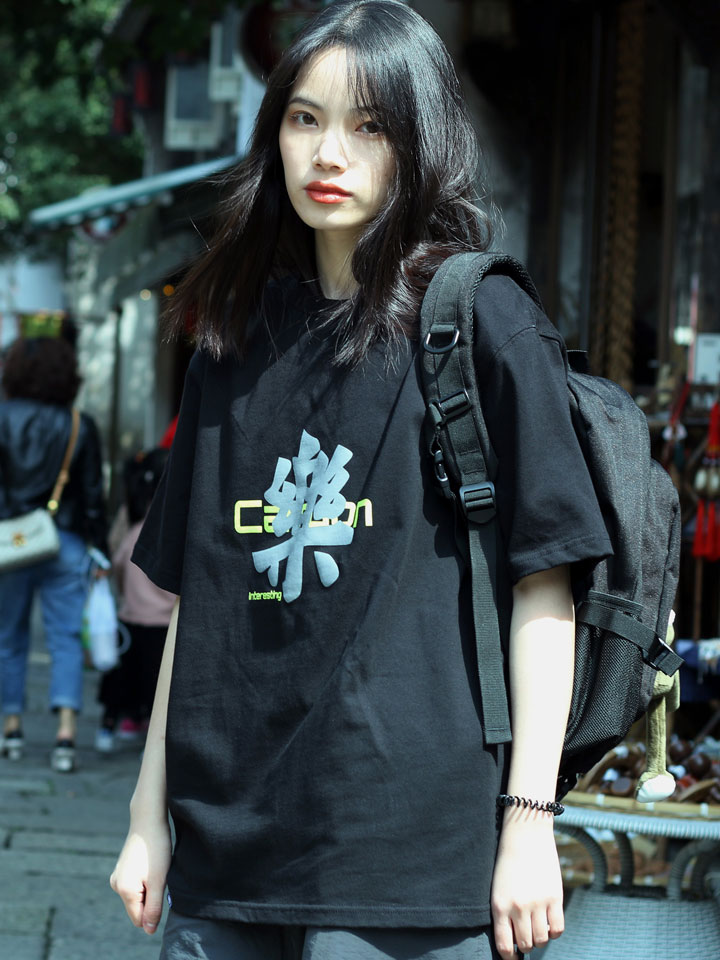 极具特色的后背印花T恤。黑的渲染,营造国潮复古风。上面的字寓意美好,尽显活力。