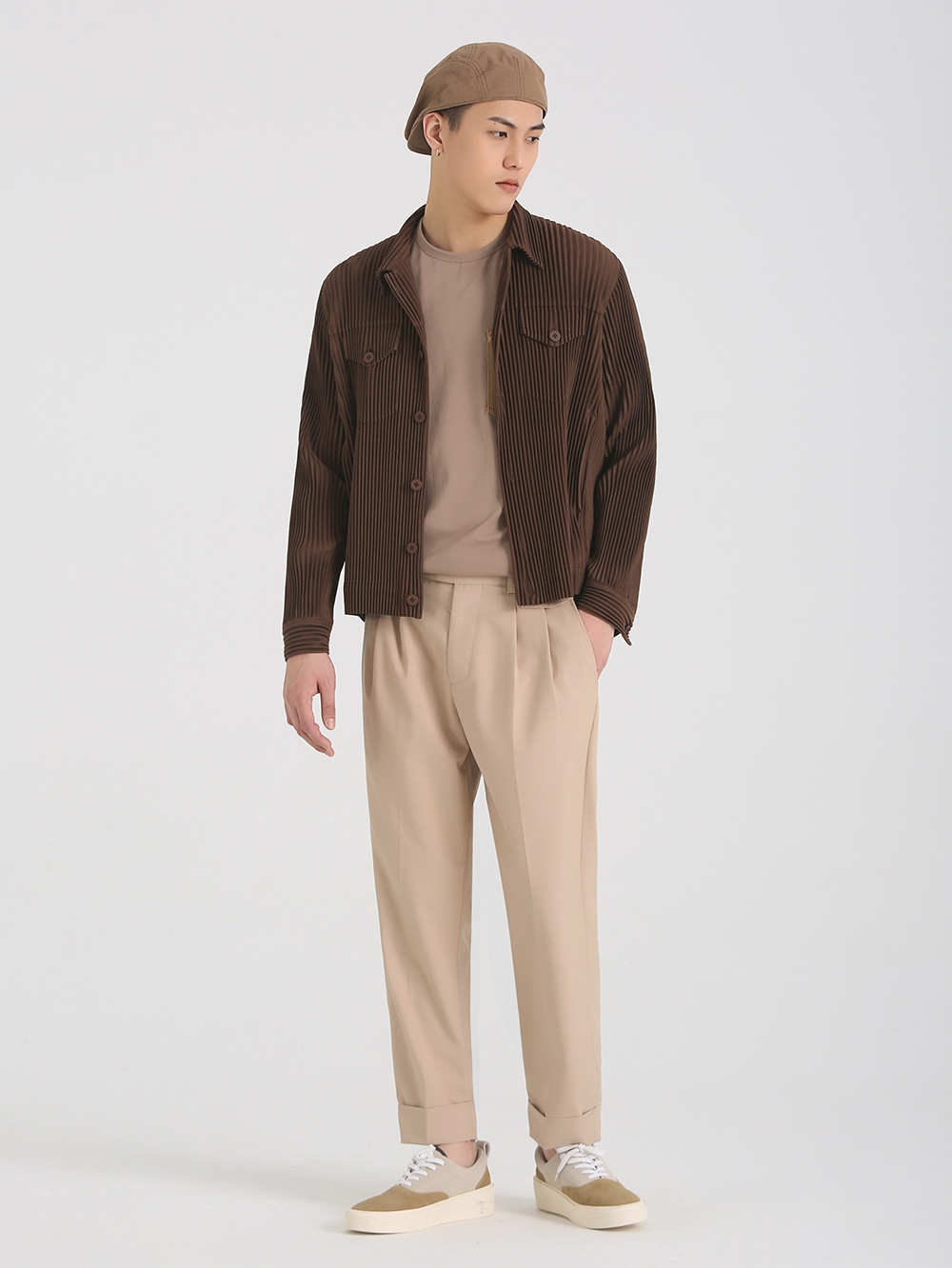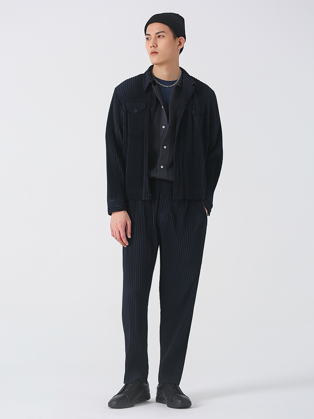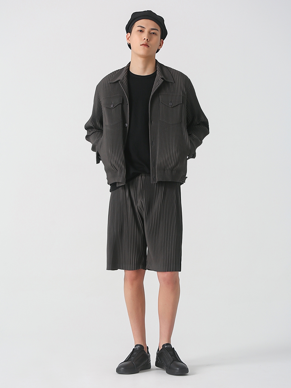 褶皱美学工艺,突破尺寸限制,用机器进行成衣热压做出来的褶皱工艺性很高,配合夹克的立体裁剪工艺层次感,线条感,型度感皆有。