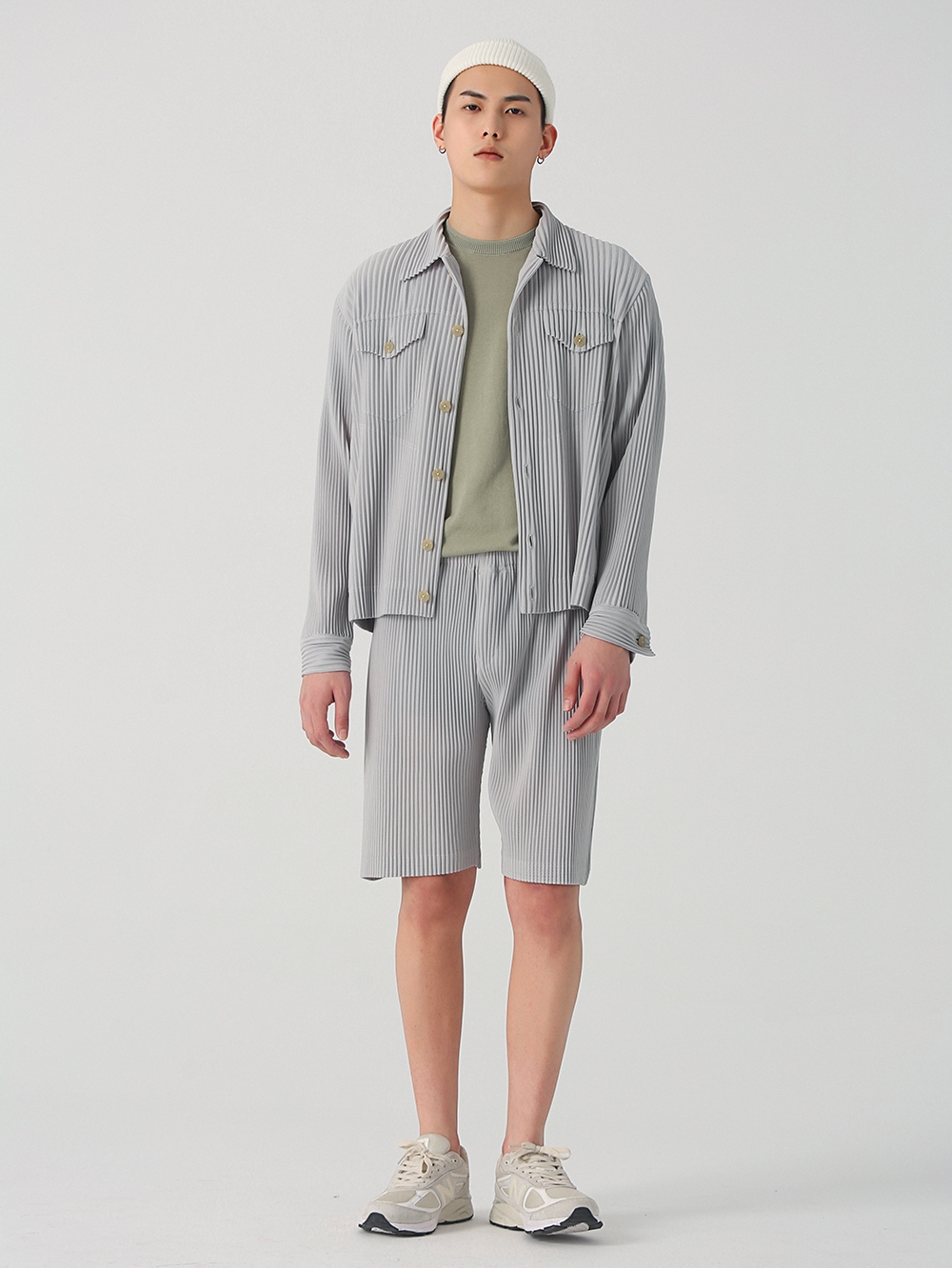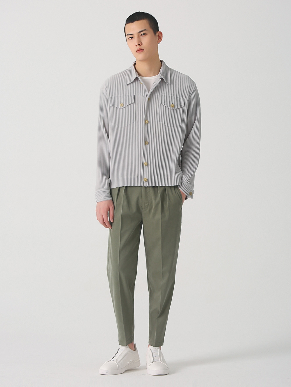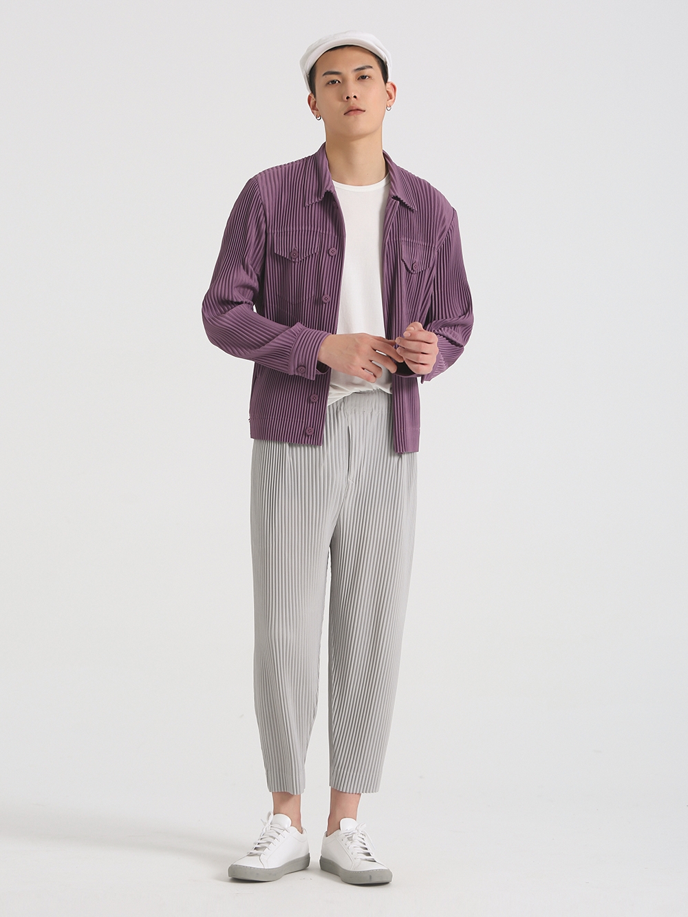 褶皱美学工艺,突破尺寸限制,用机器进行成衣热压做出来的褶皱工艺性很高,配合夹克的立体裁剪工艺层次感,线条感,型度感皆有。