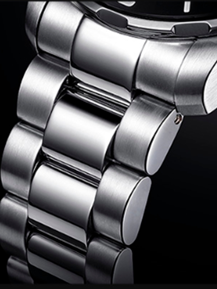 人工蓝宝石玻璃材质表镜,硬度仅次于钻石,莫氏硬度高达9.0,单历开窗,增加表盘可读性,便于全面掌控时间,不锈钢表带,精艺抛光,耐磨耐刮。