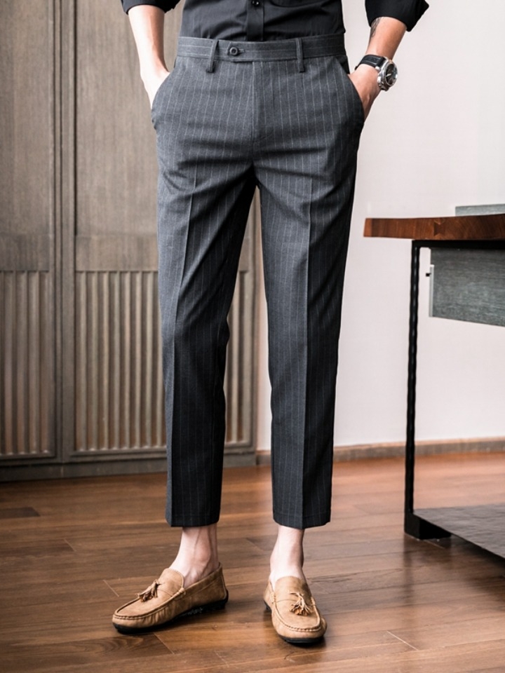 修身剪裁将腿部线条-呈现与之搭配的九分裤和休闲裤和休闲鞋或皮鞋,能更好地修饰男人的腿部线条。