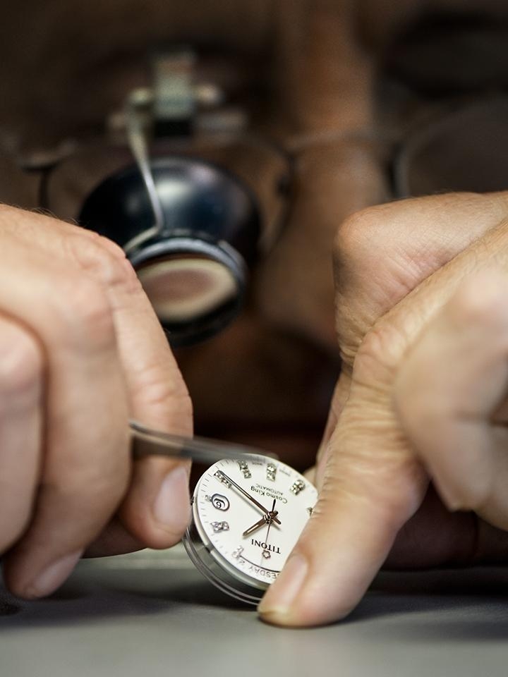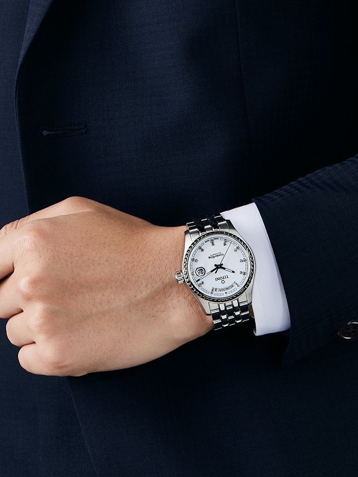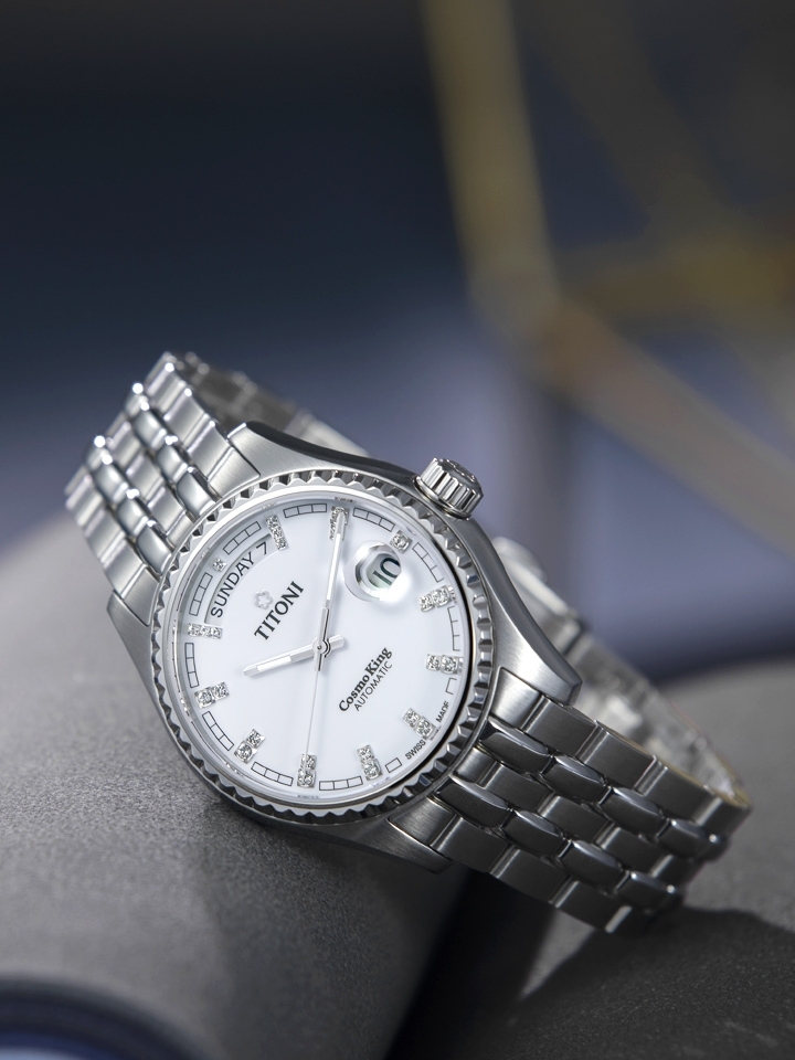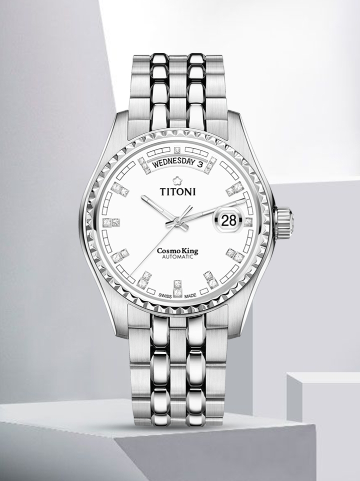 白色镶钻表盘,罗马数字刻度与亮钻镶嵌,奢华高贵魅力尽显。