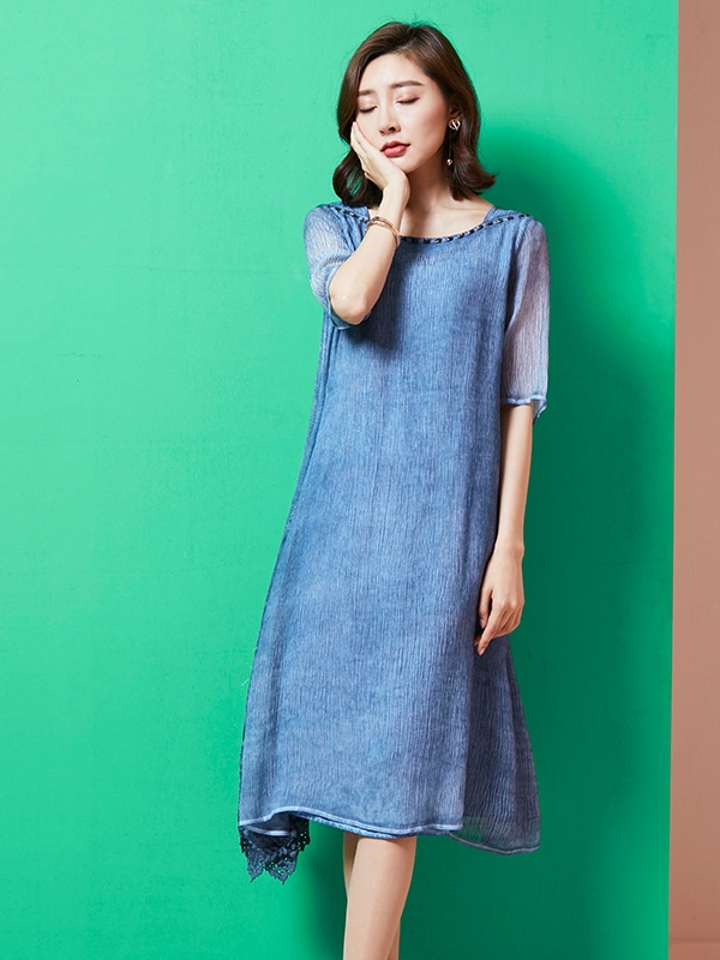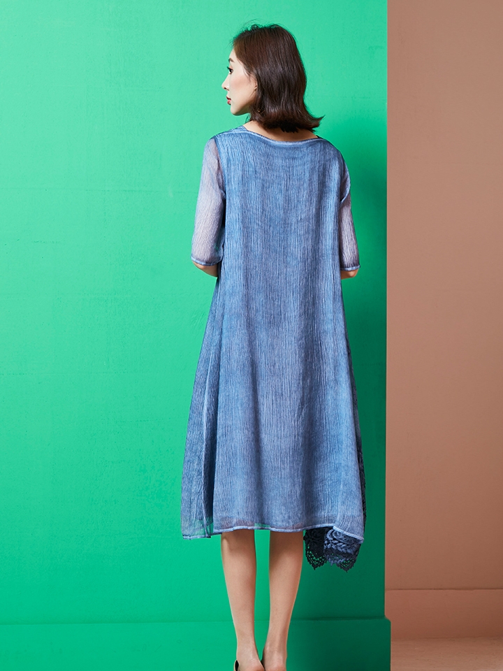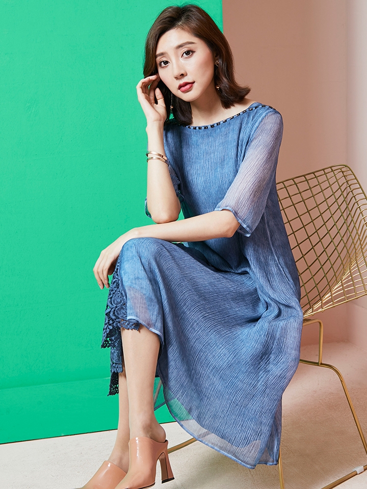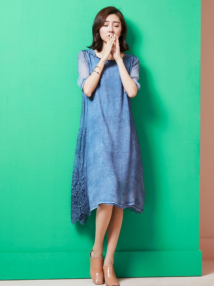 蓝色的蕾丝刺绣拼接连衣裙,显得清新典雅,可以打造复古的约会穿搭。搭配裸色单鞋,尽显干练气场。