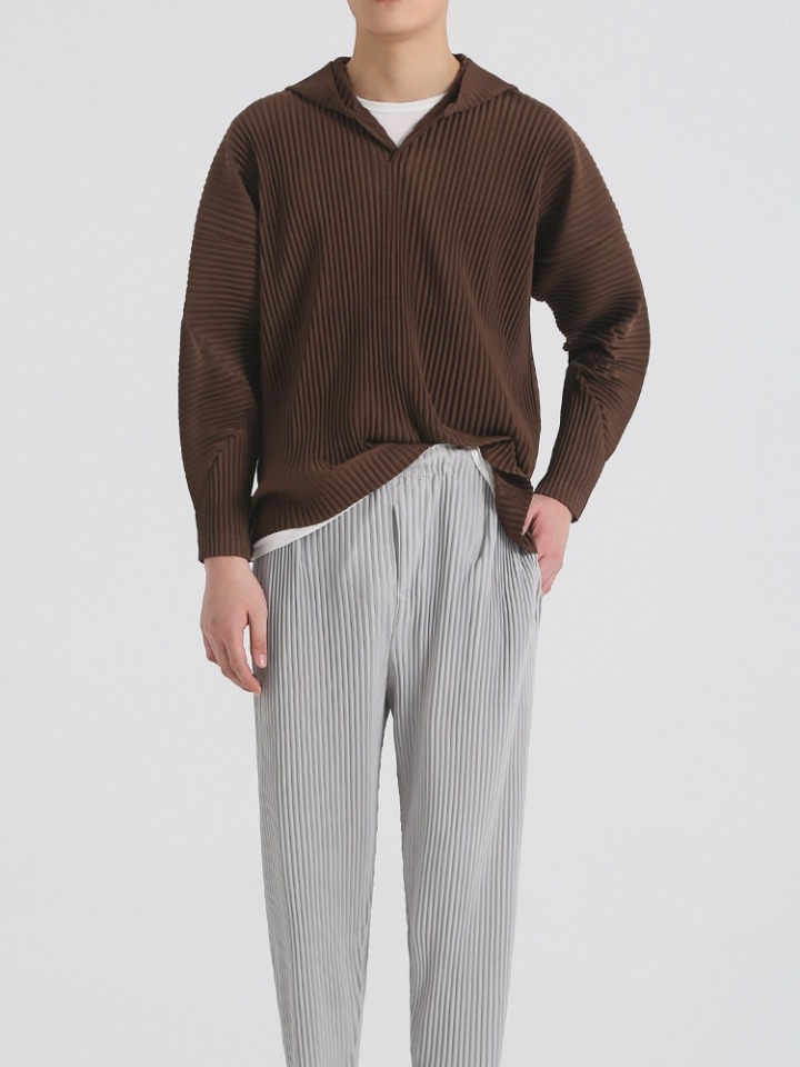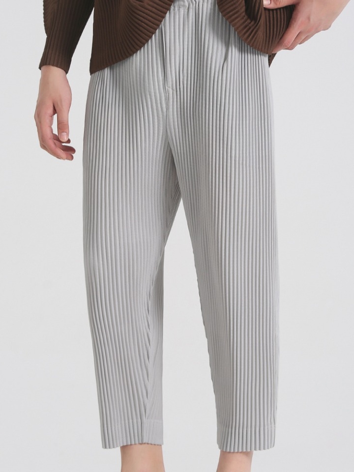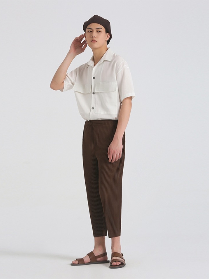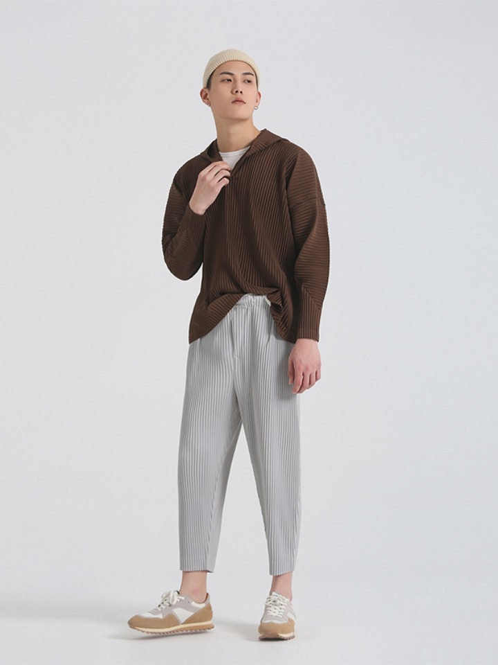 全身黑色的萝卜裤,独特的版型张扬出年轻人的个性风格,除了布满褶皱的设计,没有过多的元素装饰,呈现出极简的“性冷淡”风格,充满了日系腔调。九分的裤长在视觉上延长了腿部线条,在加上胯部宽松的剪裁,完美的遮住赘肉,微胖的小哥哥也可以轻松驾驭。