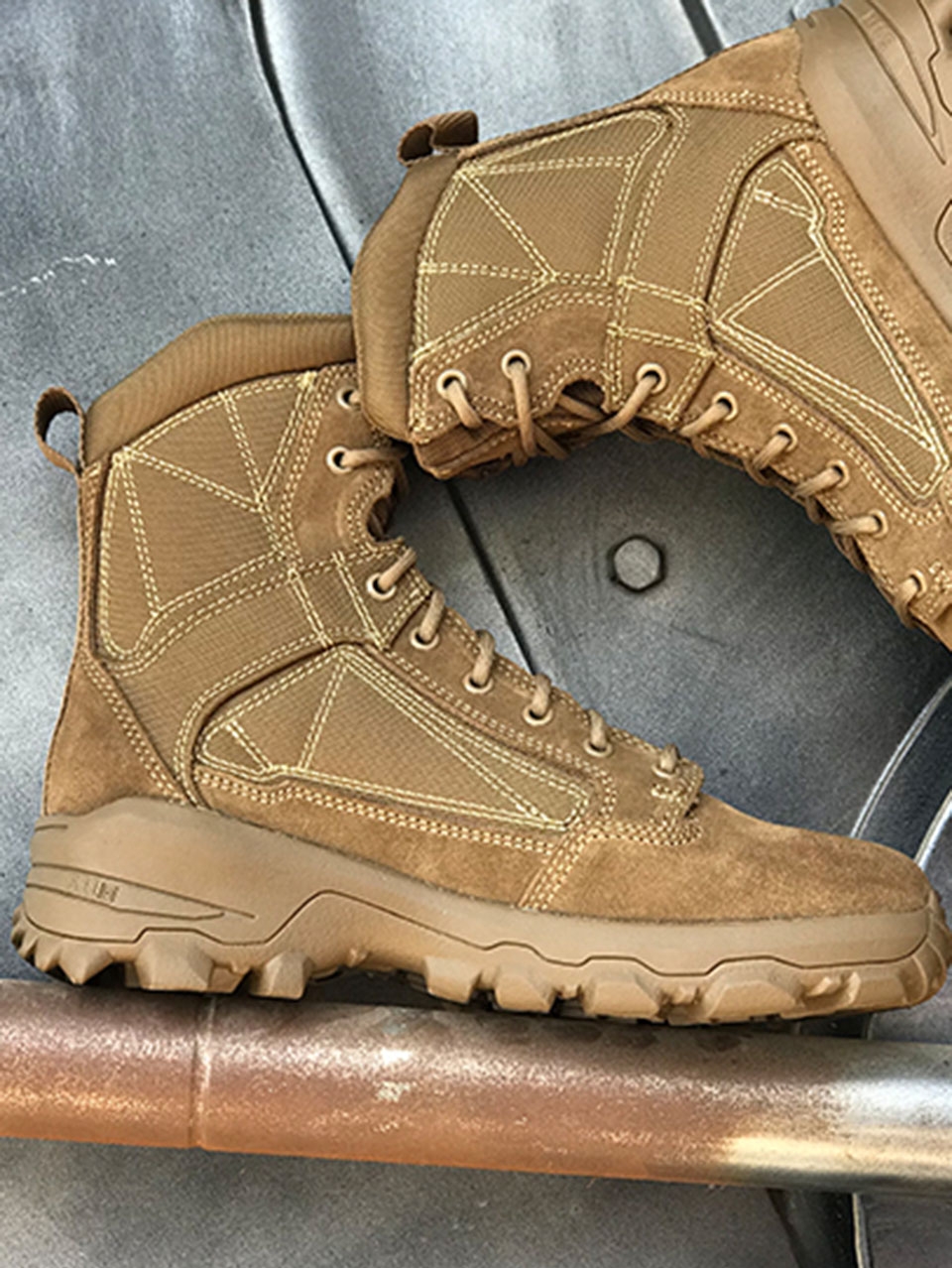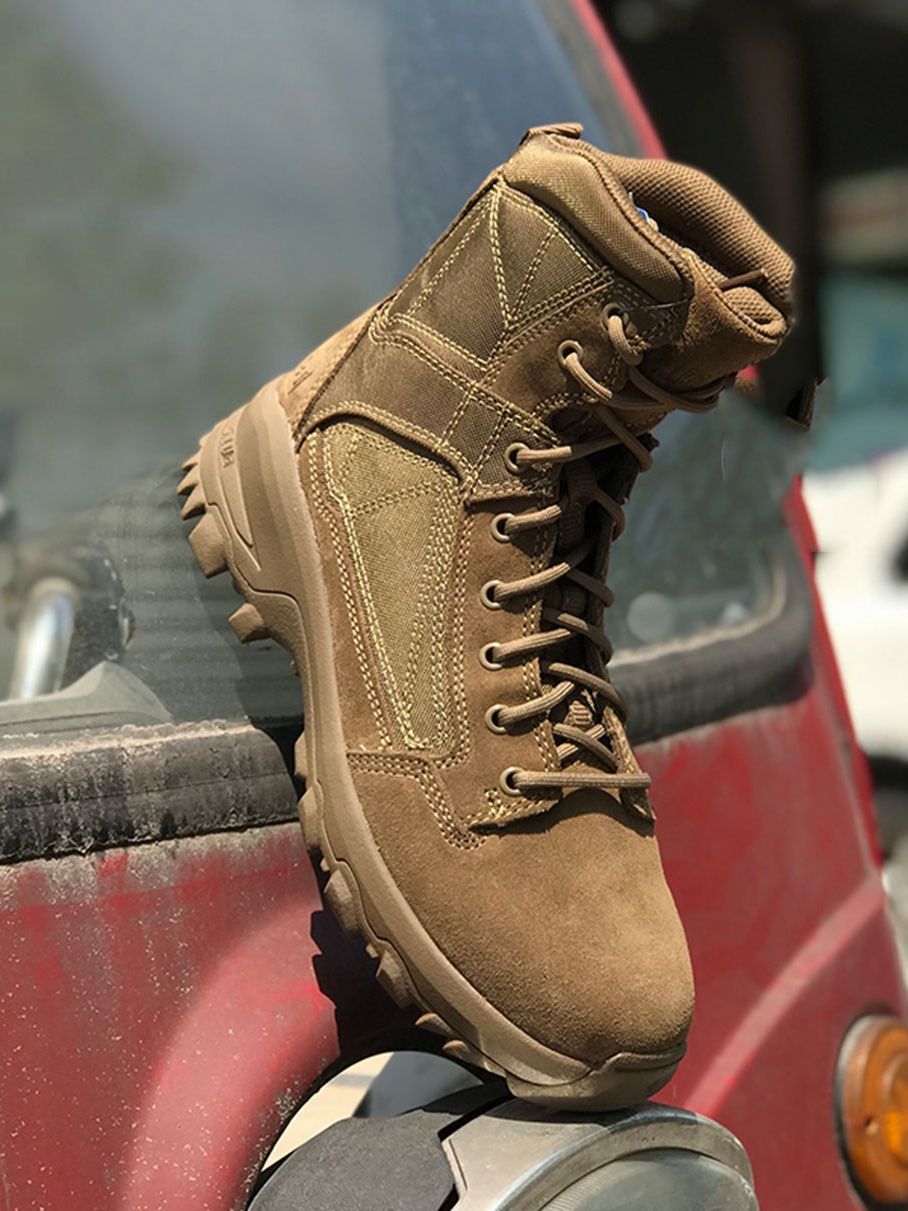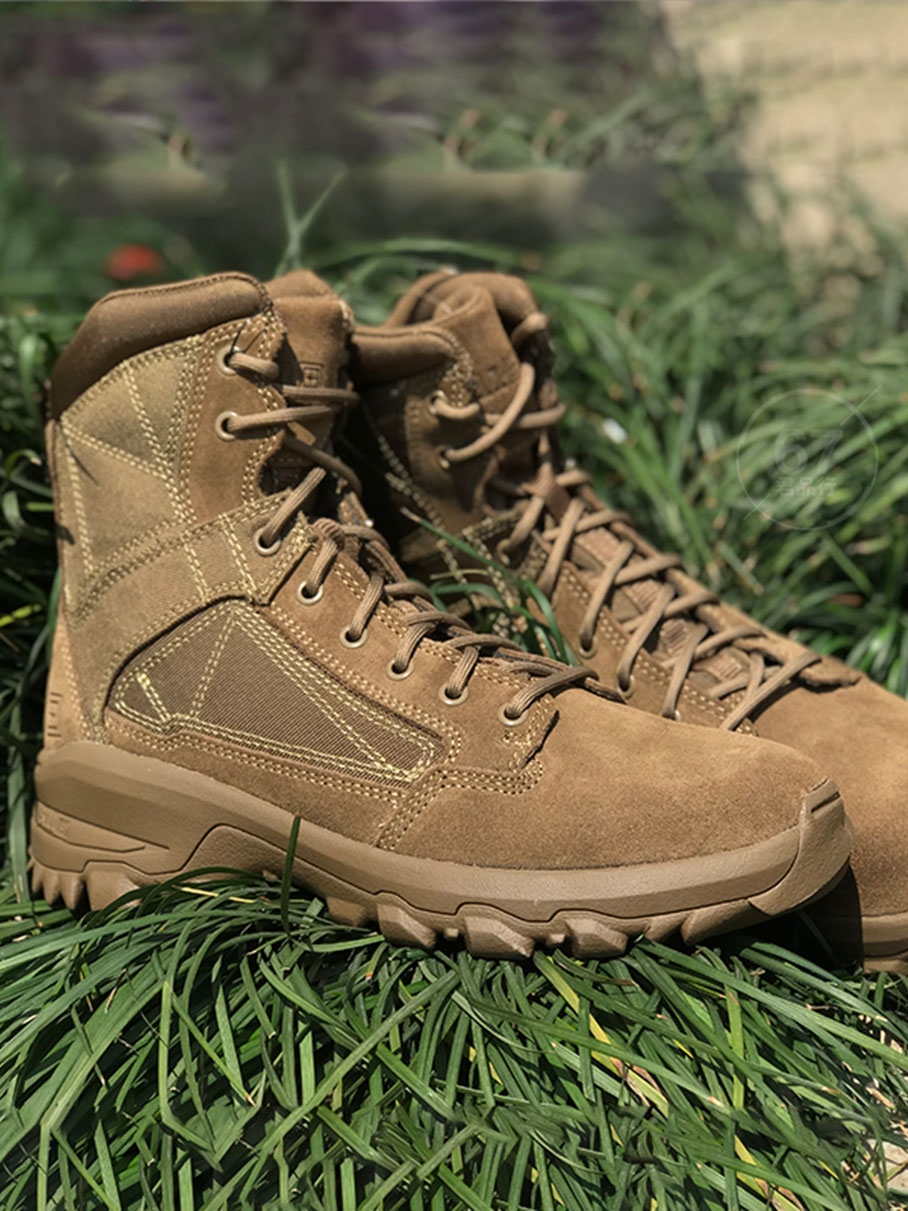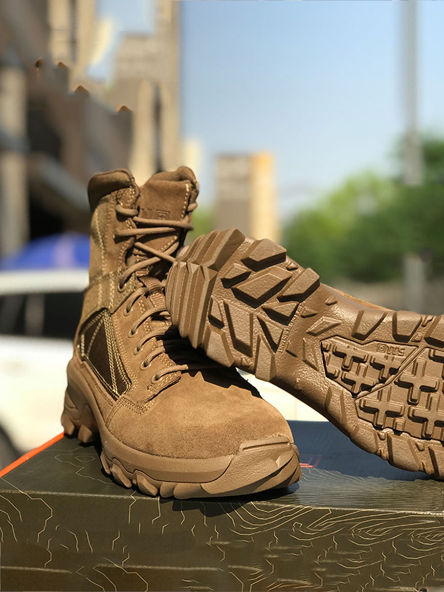 战术靴鞋面采用优质真皮鞋面,轻便透气,柔软舒适,结实耐磨;全方位防滑鞋底防滑静音,具有很好的抓地性能,有效减震,轻松应对各种地形