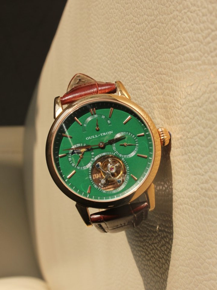 这款机械男表,表盘陀飞轮透视窗,日历小表盘相互结合,给人以高贵睿智的视觉感,体现着上海老品牌的全新面料,彰显佩戴者稳重魅力。透底表背,对精美机芯一览无余。