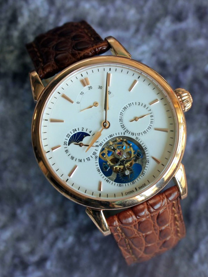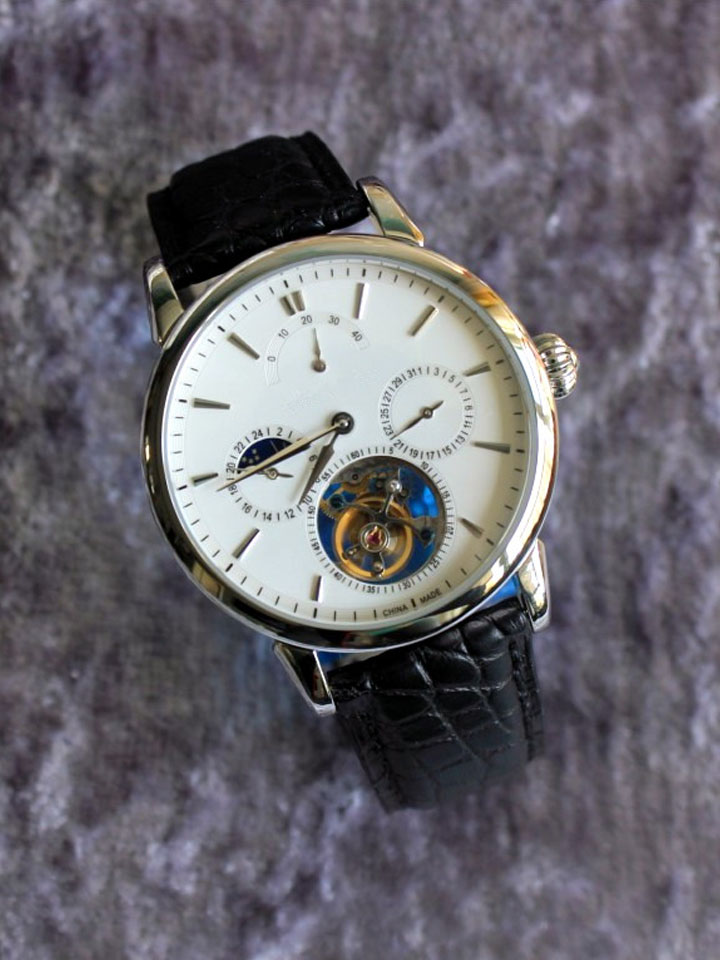 多功能机械腕表,瑞士原产机械机芯,走时精准,自动上链,使用省心,表盘镂空陀飞轮设计,奢华精致,两个类似赛车仪表盘的日历星期小盘设计,增添更多动感,功能也得到加强。