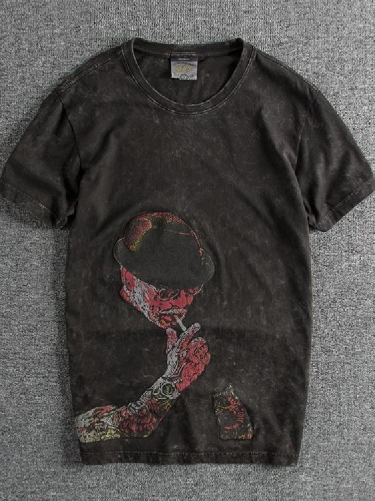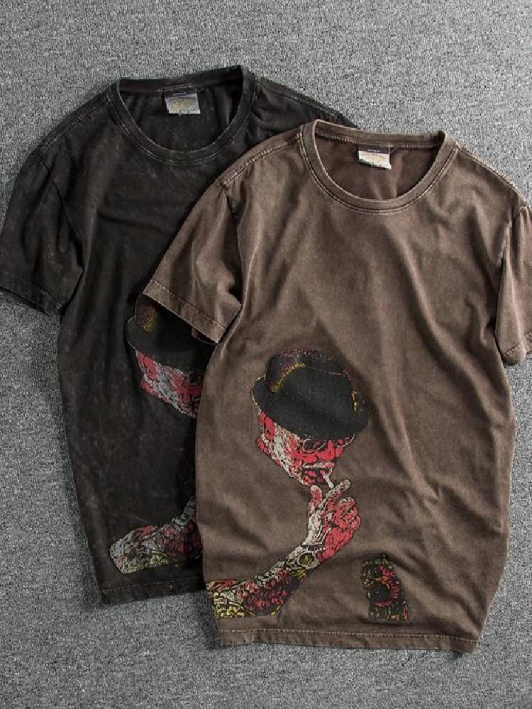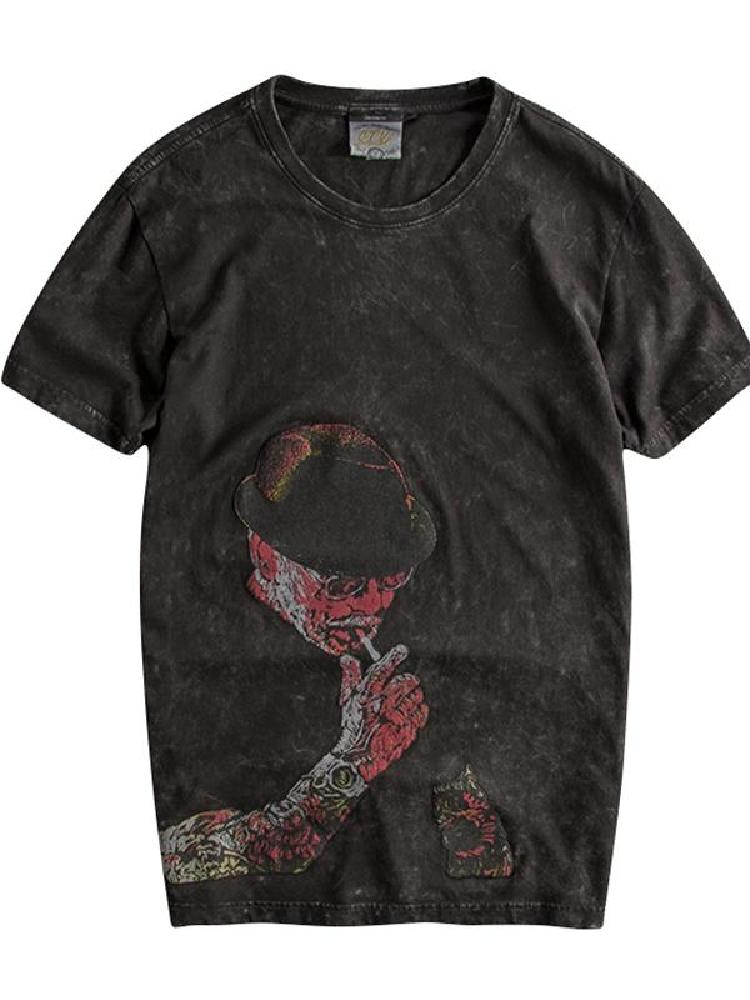 做旧的短袖T恤,破边圆领,休闲惬意,胸前趣味别致的印花图案,色彩丰富,不易掉色,衣身破点缀,丰富细节,棉质面料,透气吸湿,单穿就OK啦。