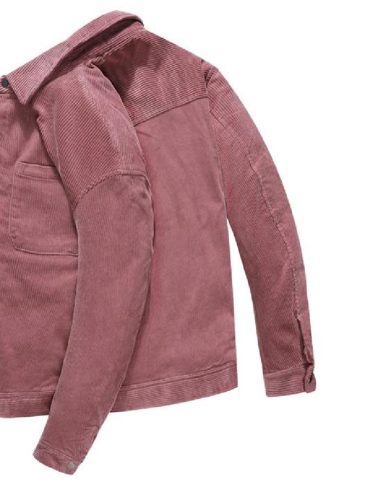 灯芯绒材质的棉衣,很容易把我们拉回到小时候,总觉得冬天只有灯芯绒的衣服才够暖和。这件短款灯芯绒,是夹克的感觉,色彩很是复古。
