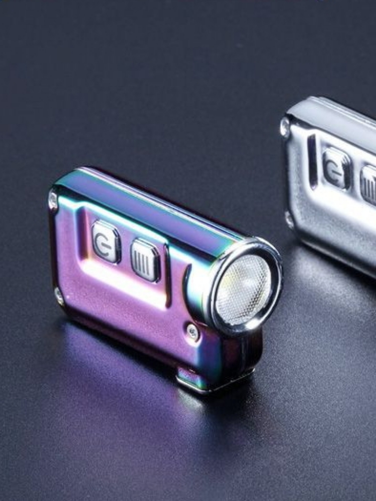 采用了高强度的不锈钢为主体打造而成,表面进过PVD真空镀钛处理,使其流光溢彩,外观看着别具一格,小巧精致,金属钥匙扣照明灯。