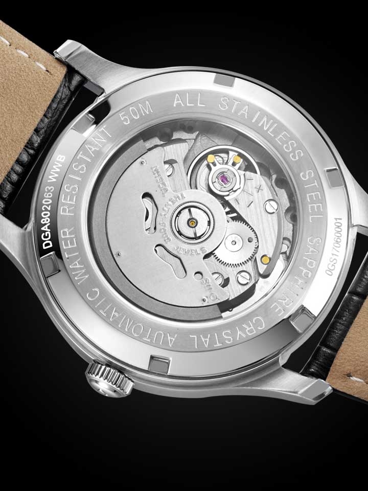 进口机械机芯材质,背透设计可观赏摆陀运转,实心精钢表带耐磨耐刮,质感坚毅。