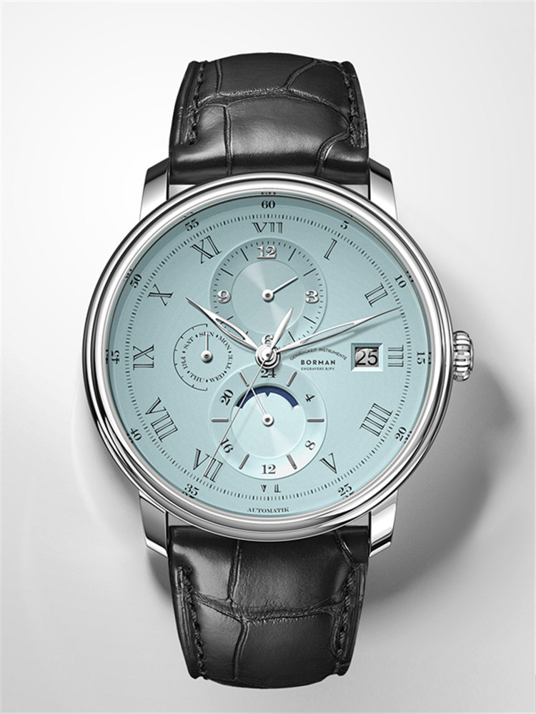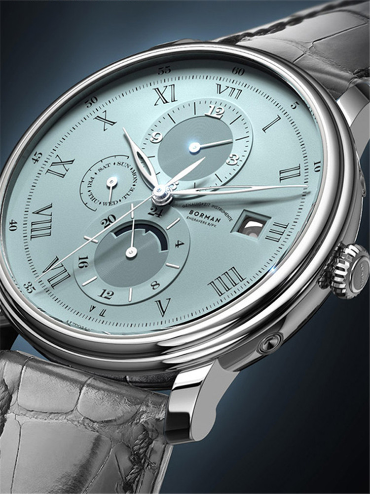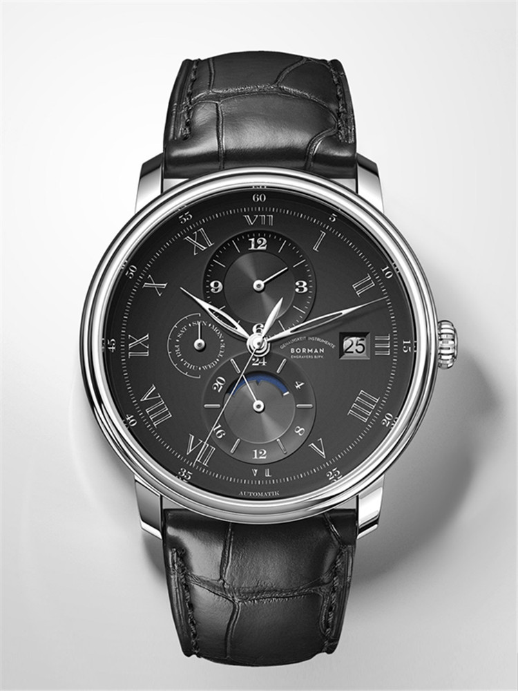 表盘上左右对称的日历和星期显示,与表盘下方的飞轮装置形面微妙平衡。使整体表盘布局优雅大气而又融会贯通;搭配上真皮表带时刻渲染着霸时尚风范乌黑的表壳更是给人几分神秘感。