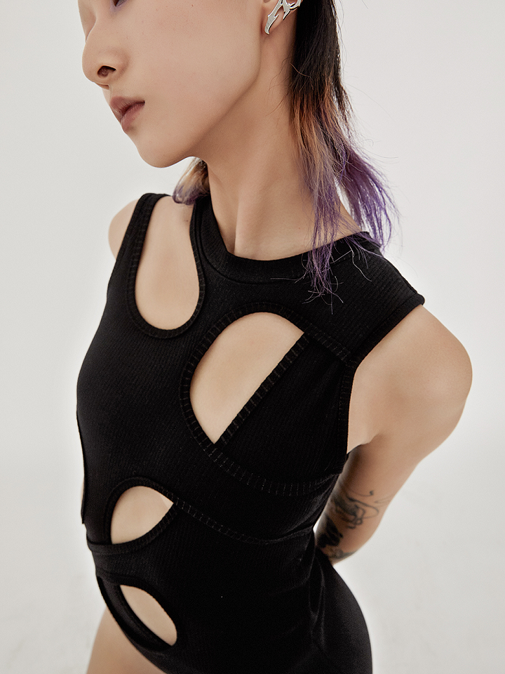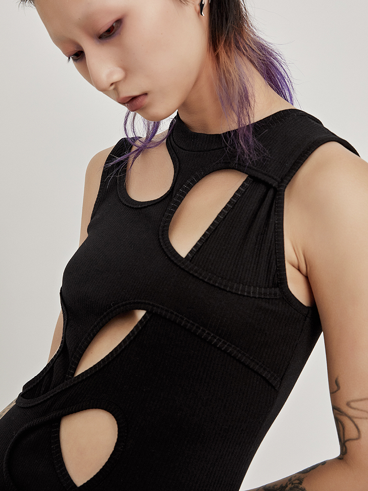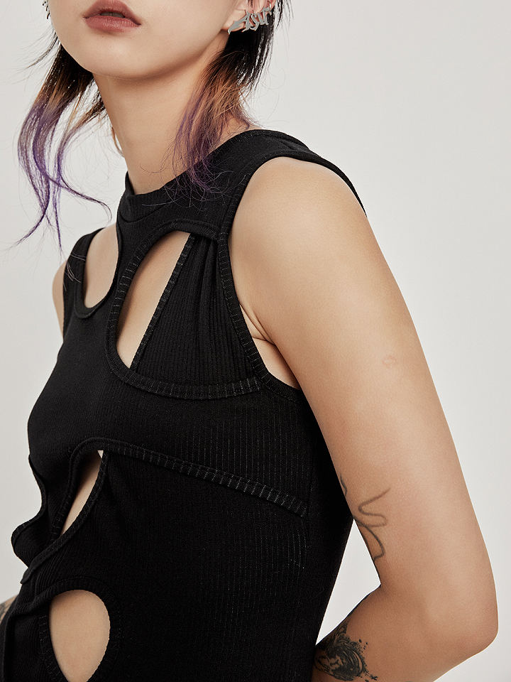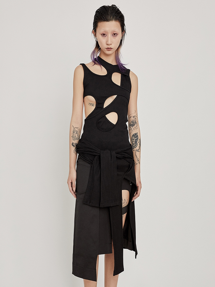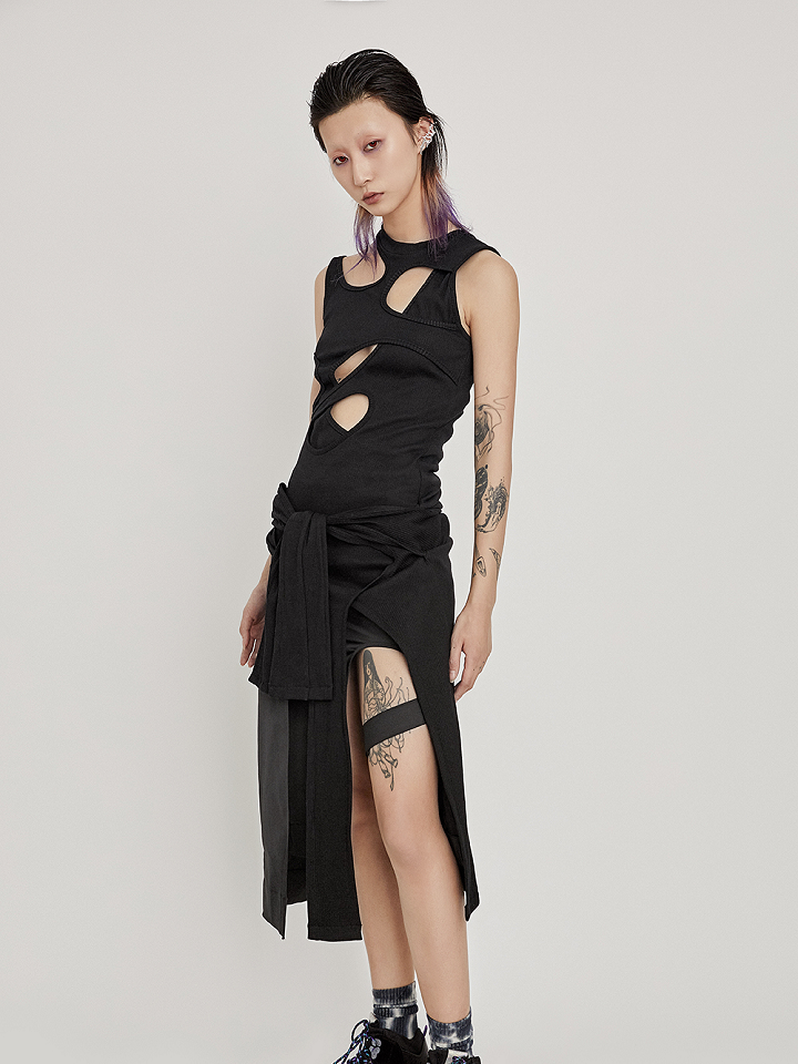 不规则破洞背心连衣裙,穿插设计和漏洞的剪裁富有层次感,H型版型设计,又街头又暗黑,完美体现了女孩们的形体美。
