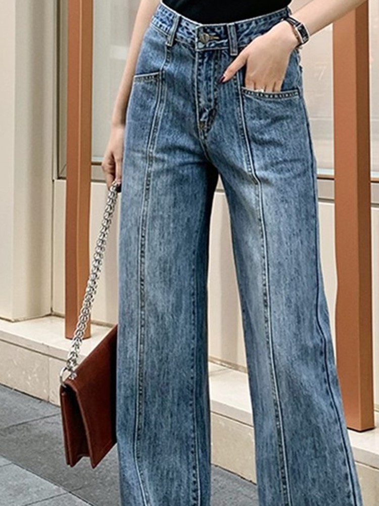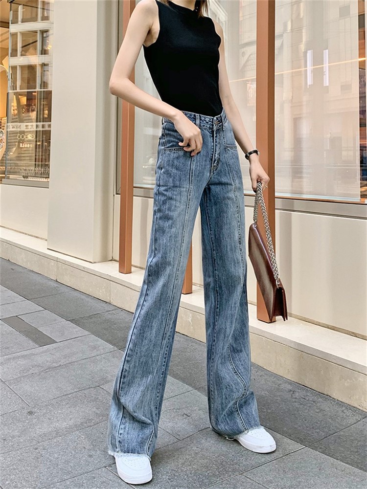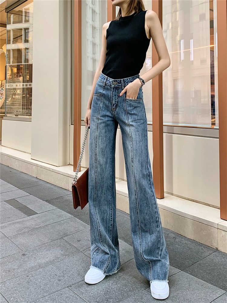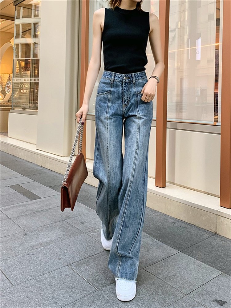 高腰设计,拉长身材比例。高腰牛仔裤,显瘦显腿长。直筒裤型,修饰腿部线条。