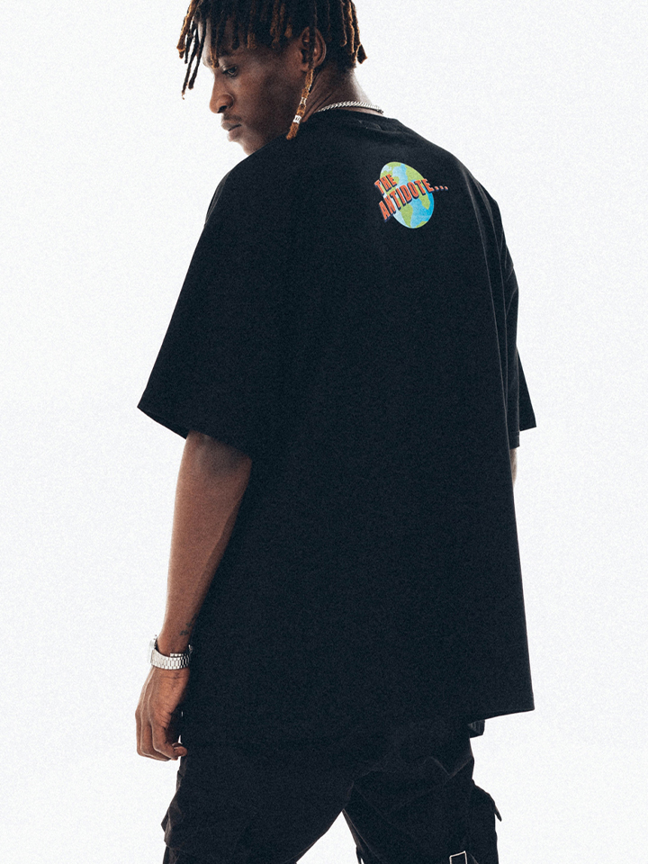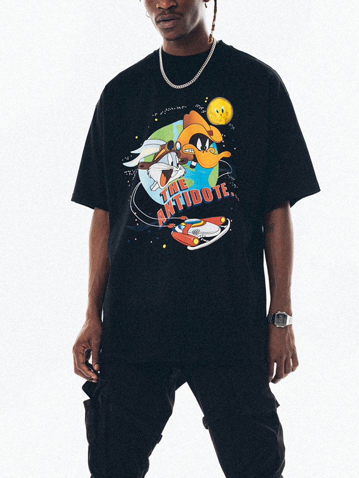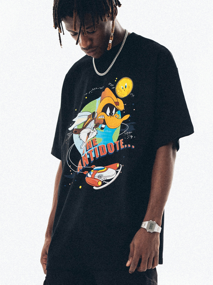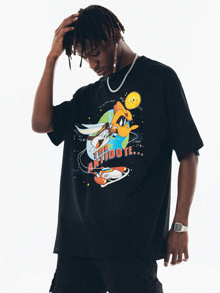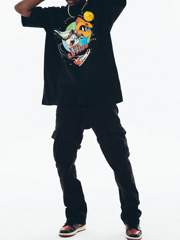 这件T恤的风格是比较街头的,衣服的主体颜色是黑色的,正面有一个大大的印花,卡通的动漫设计,很搞怪的感觉。