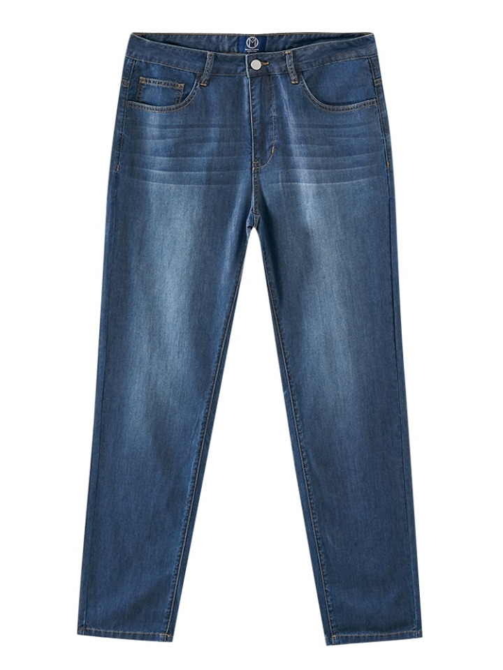 高腰直筒裤型设计,穿着具有修饰腿型的效果。优选棉感牛仔布料制成,具有较好的弹性,穿着贴身显瘦不紧绷。