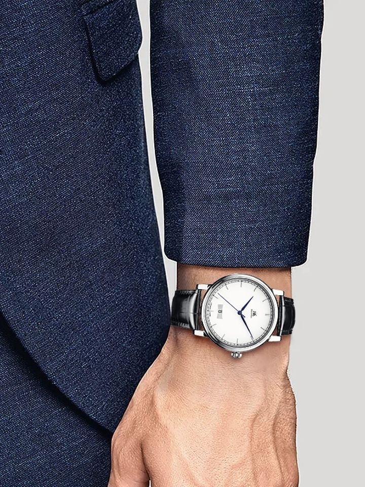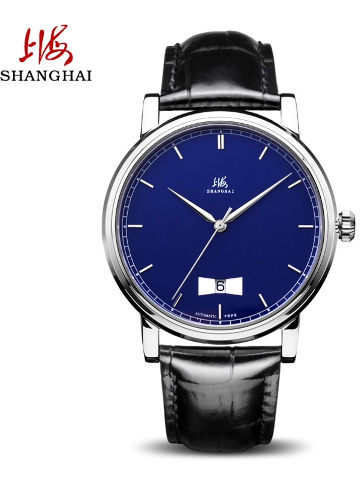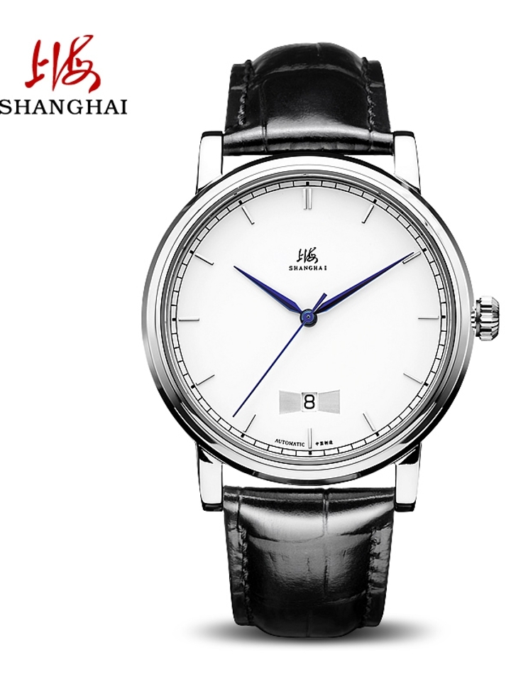 上海牌手表始于1955年,本款机械表选用简洁素雅白色大表盘,大三针配以宝蓝色撞色阿拉伯数字刻度,3点方向日历显示,清晰一目了然!斜面立体设计