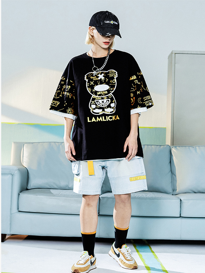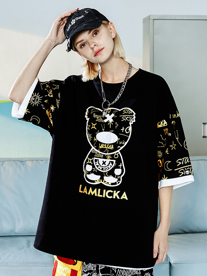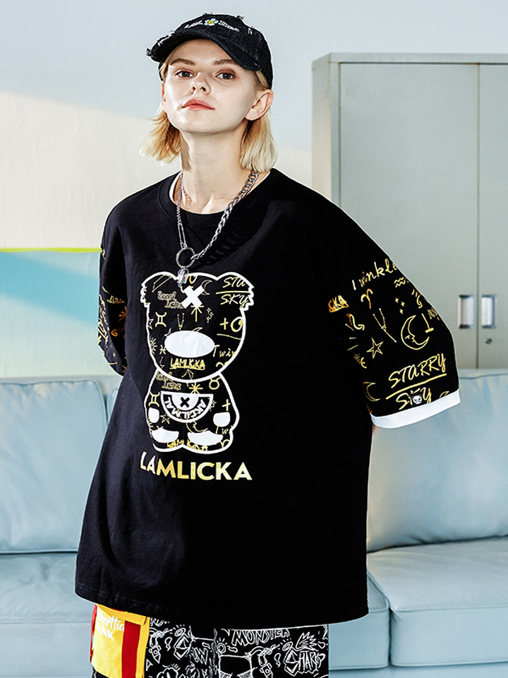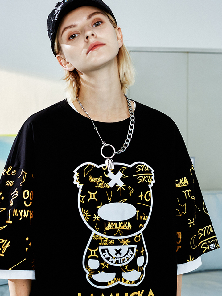 这款T恤衫最大的亮点在于衣身融入的烫金熊猫印花设计,个性吸睛,很有设计感,并赋予衣身满满的活力趣味性,给人眼前一亮。