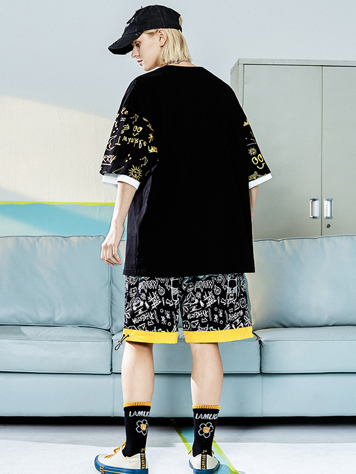 黑色作为永不过时的经典色系,不管怎么搭配都不会出错,下身选择满印短裤,脚踩系带板鞋加以收尾,潮酷有型,轻松凹出街头潮流造型。