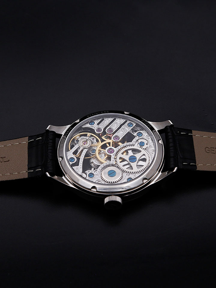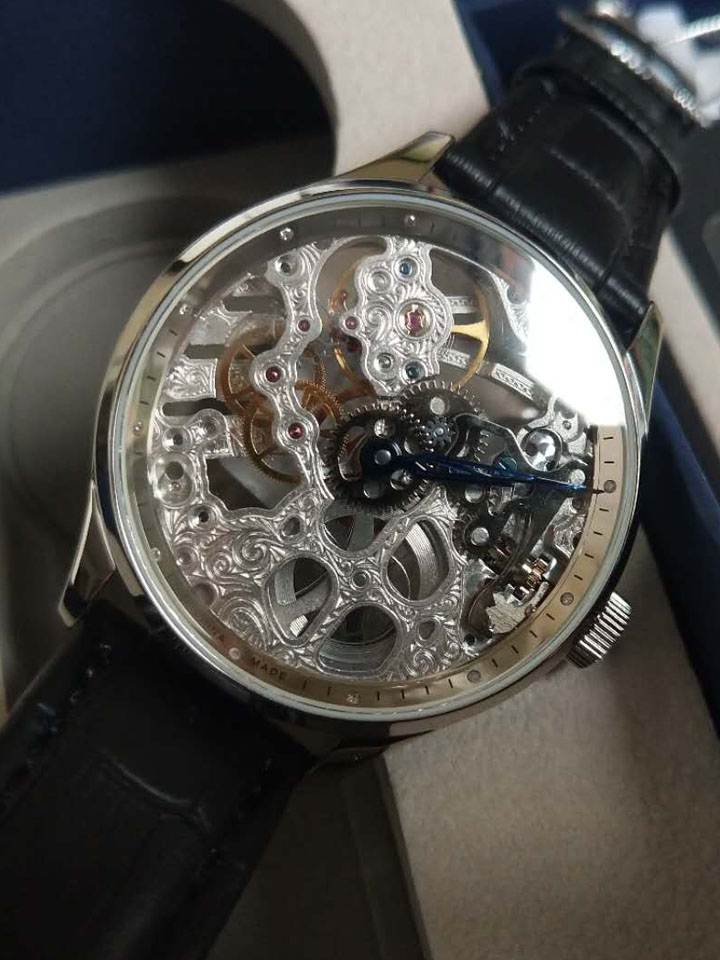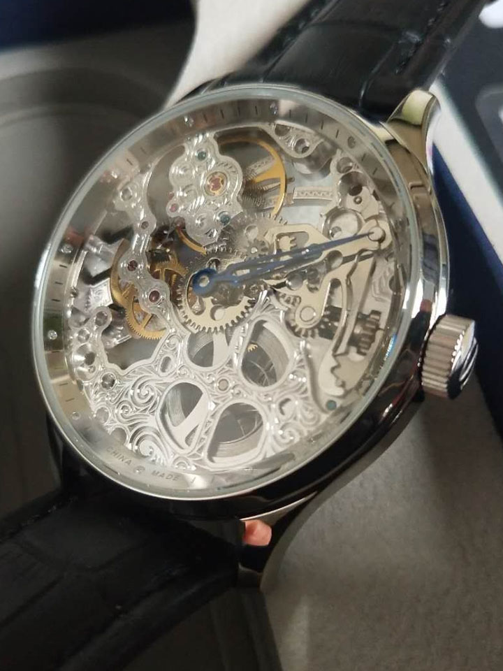 采用超薄机械机芯,蓝宝石表镜下是全镂空的表盘设计,展现精美绝伦的机械魅力,犹如中国剪纸般精致。
