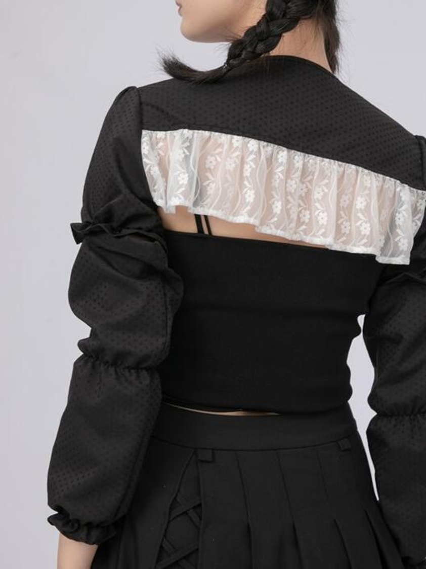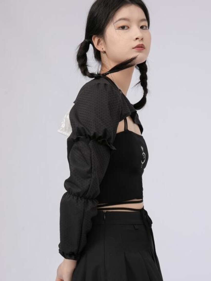 纯色的外套演绎出百搭的效果,披肩式的设计有着俏皮的穿着感。肩部的搭扣突显出帅气,短款的版型让衣服更显时尚,小翻领的样式演绎出干练。超短款的设计在视觉上拉长了身材比例,下摆的毛须彰显时尚的个性。宽松的剪裁不挑体型,非常百搭,这件独一无二的牛仔外套为春季造型增色不少。很有型,荷叶袖和大翻领的设计,大方中带着优雅,背部到手肘的设计很独特,造型感很强,整体对于身形的修饰很好