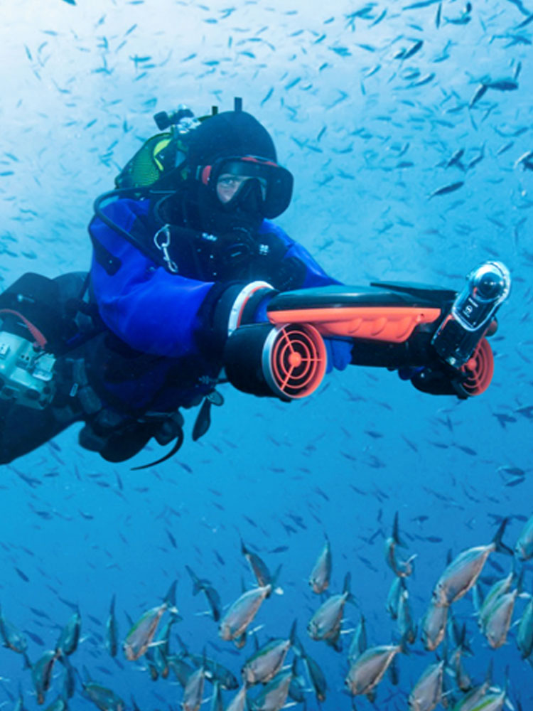 体量轻巧,可设置单手操作,更加均衡平稳,同时也解放了另一只手,使耳压平衡、水下摄影等操作得心应手。同时兼具速度与力量,3档速度档位快速切换,适应不同潜水负载量、观景位置、 水域环境。