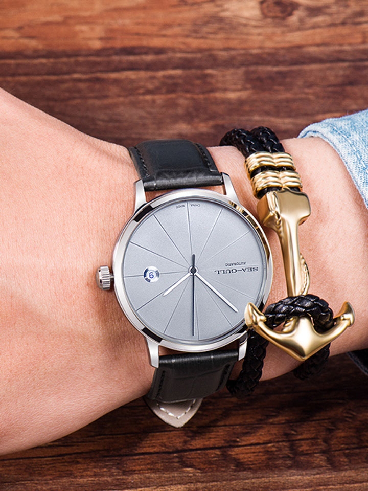 Seagull/海鸥表本季推出了自动机械表,经典的圆形表盘融合了技术与美学,三指针,日历等细节设计,提升了这款手表的美观度。