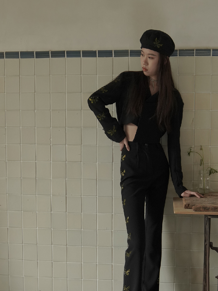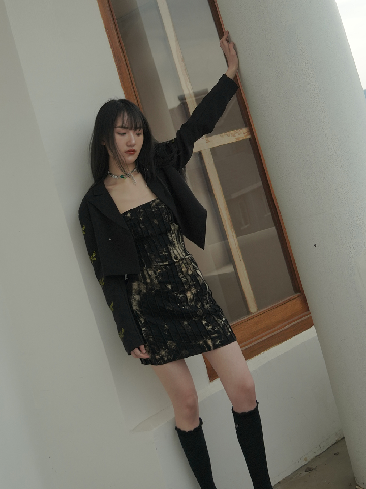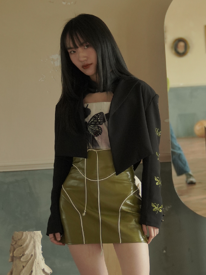 前长后短不对称设计,打造专属设计,短款露脐设计,显高显腿长,翻领设计,复古优雅,袖子蝴蝶烫钻造型,设计感十足,凸显亮点。