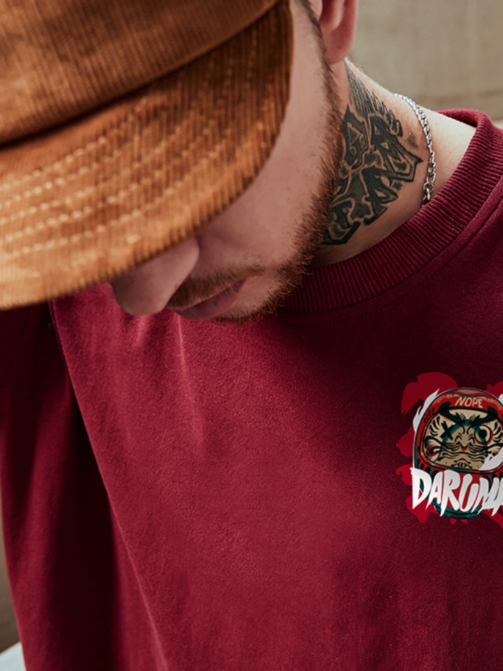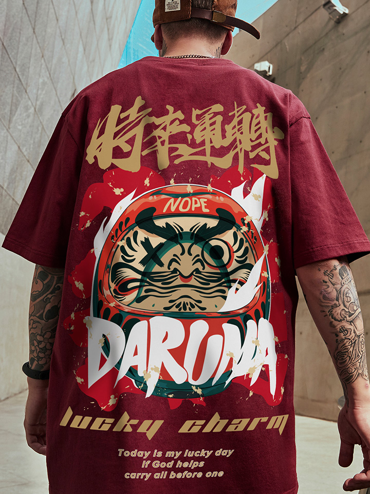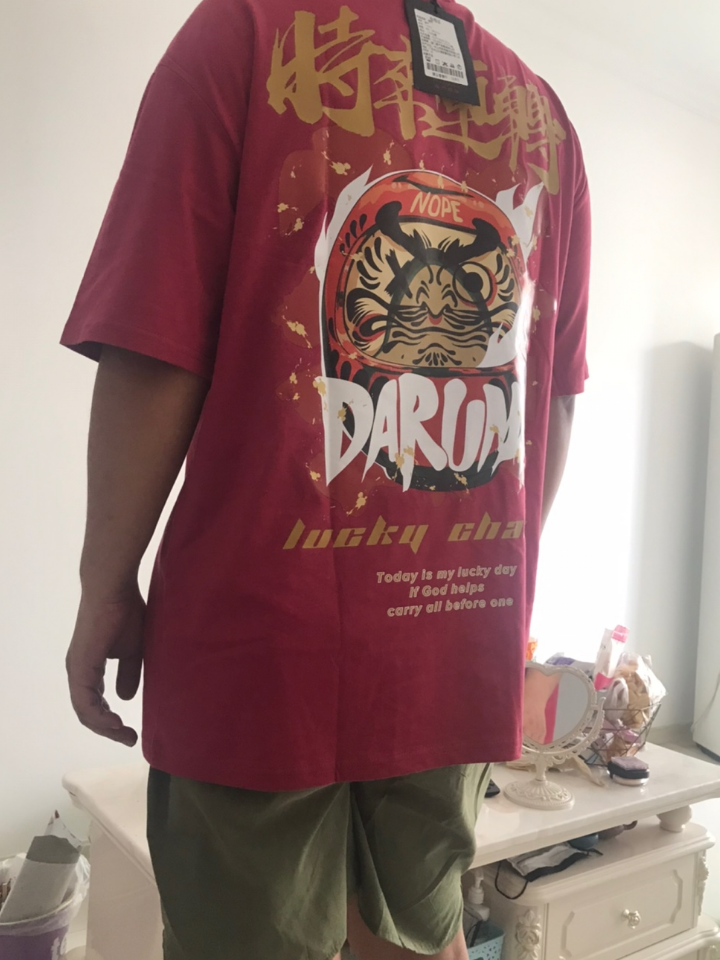 这款短袖t恤,后背的立体感“时来运转”文字印花,饶有趣味,红金配色,更加强了中国风味道,腔调十足。