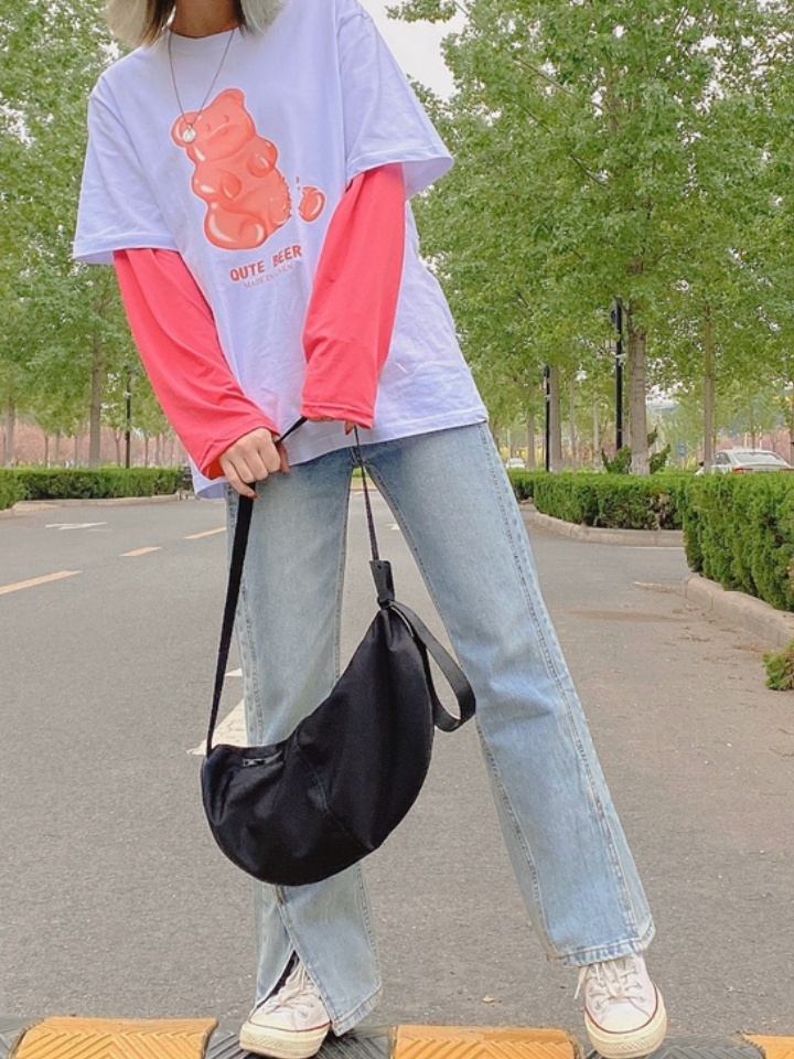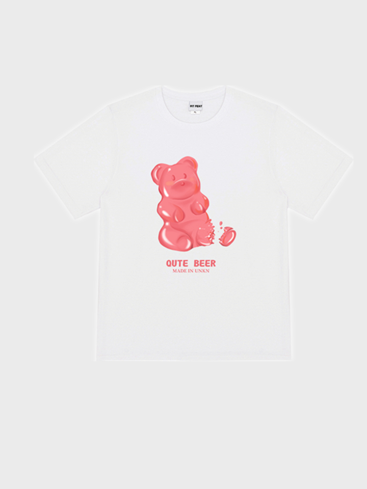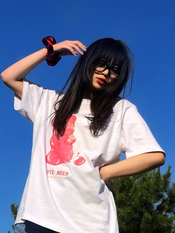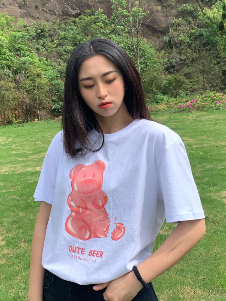 超级简约时髦的一款短袖T恤,以纯色元素为主,结合小熊印花点缀短袖T恤上,形成强烈视觉反差的同时,增强个性感。