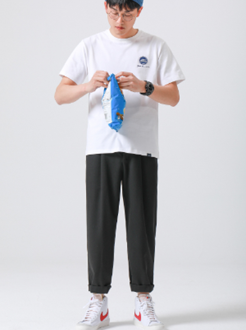 经典的白色T恤,搭配黑色的休闲裤,释放出无限的阳光魅力,脚蹬系带小白鞋,轻松出街,回头率满满。