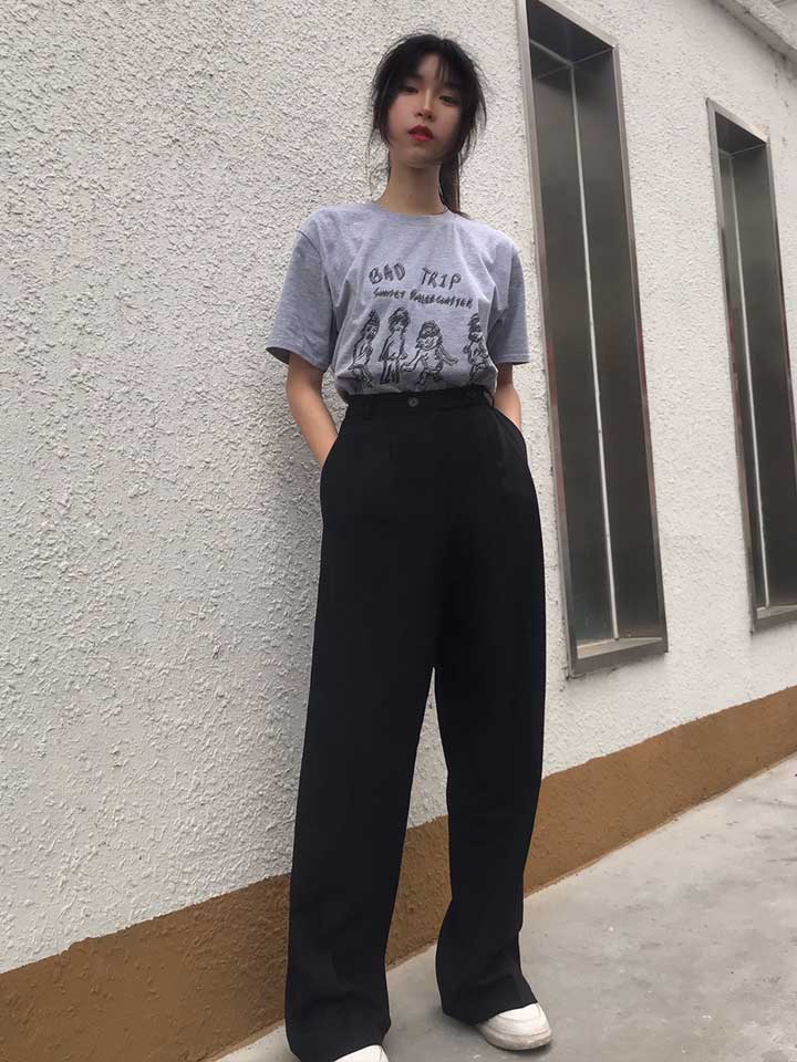 黑色的长裤搭配上这款文艺风的T恤,再把衣服扎在裤子里,整体的比例十分的高挑,显瘦又休闲。