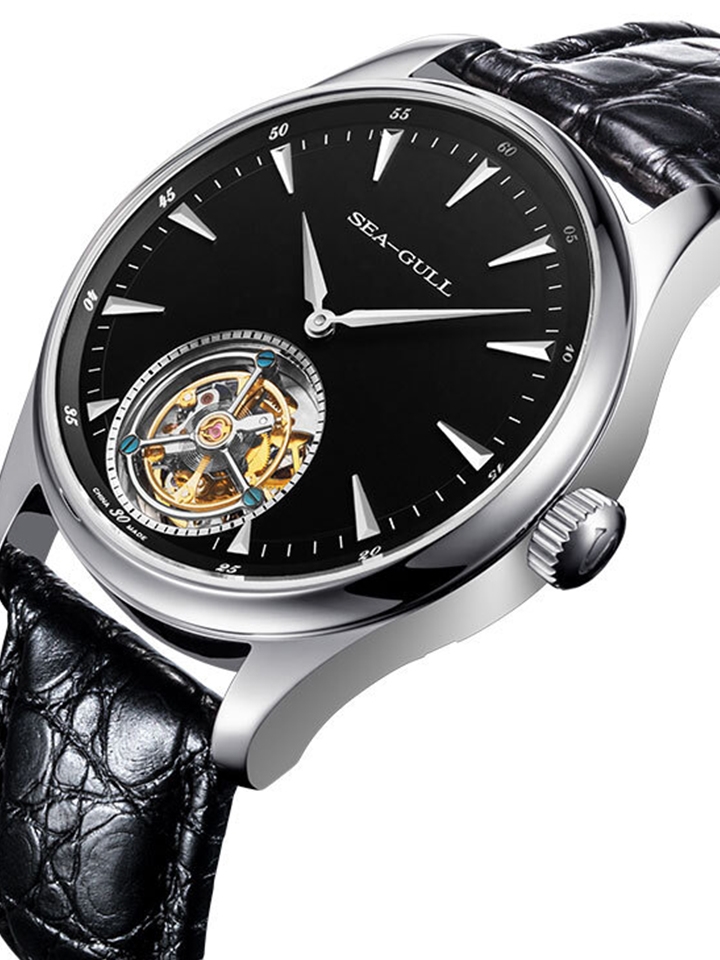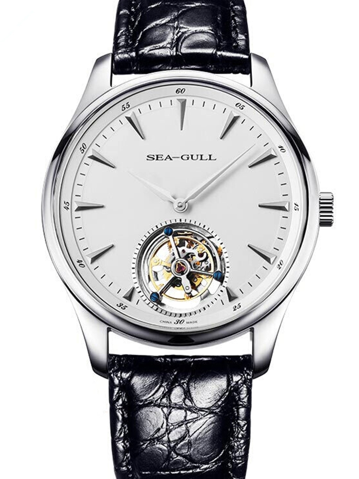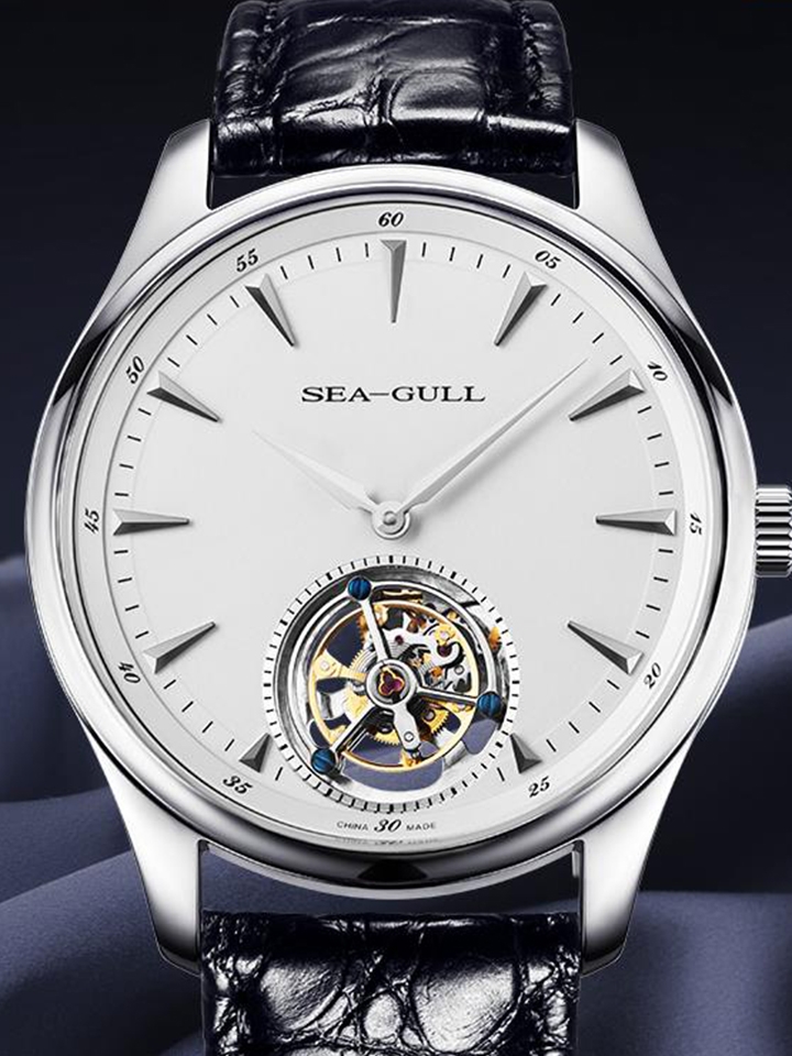 海鸥牌手表始创于1955年,至今已有60多年的发展历史。这款手表采集极简的搪瓷表盘设计,煅烧蓝指针搭配六点位置同轴无卡度陀飞轮镂空机芯。