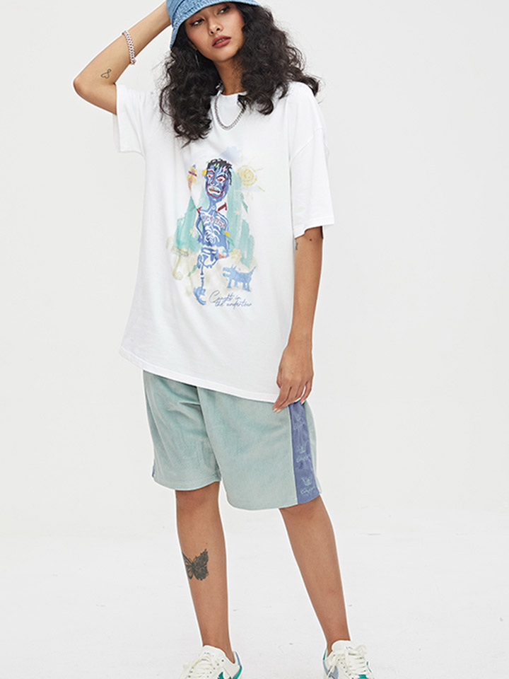 正面以撞色的恶搞涂鸦印花加持,充满了趣味性。背面再经由字母的修饰,体现文艺的时尚腔调感。落肩的设计,在一定的程度上削减了肩部粗壮的线条感,随性惬意。