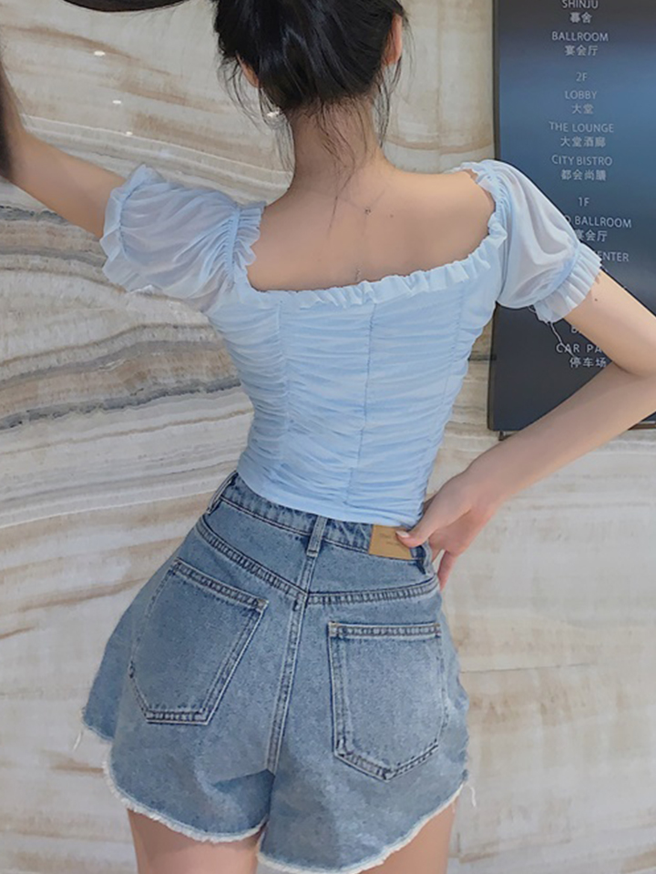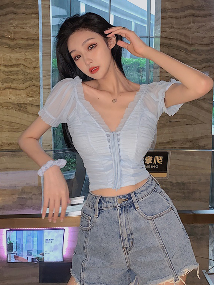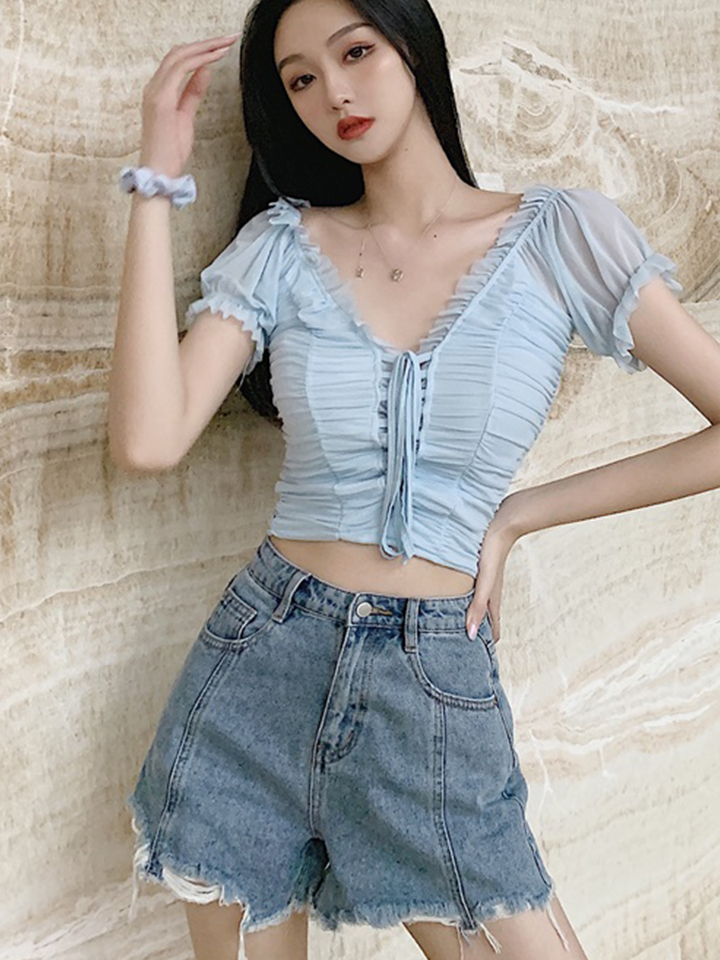 这款浅蓝色的V领网纱上衣,下身可搭配件经典又时尚百搭的毛边牛仔短裤,流露着甜美秀丽的少女气息。
