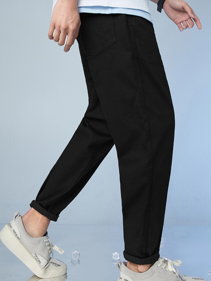 腰头白色压线,沿边展现撞色装饰,丰富质感。裤脚磨边设计,散发不羁洒脱风情。
