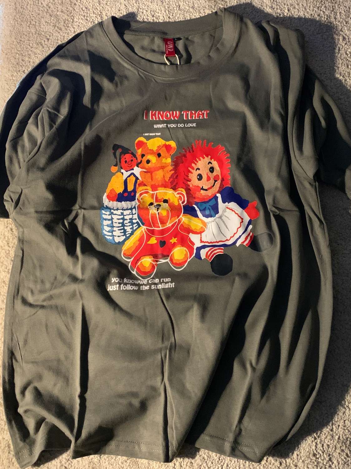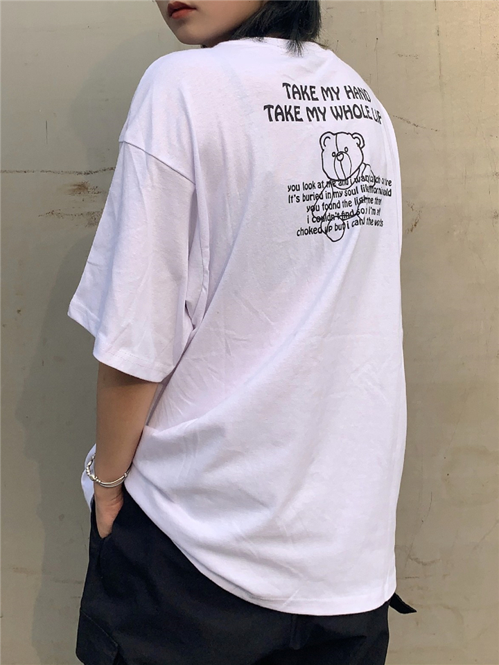 情侣款圆领短袖T恤,三款纯色调带来不同的风格,小熊和小女孩图案印花,时尚中带点可爱的感觉。
