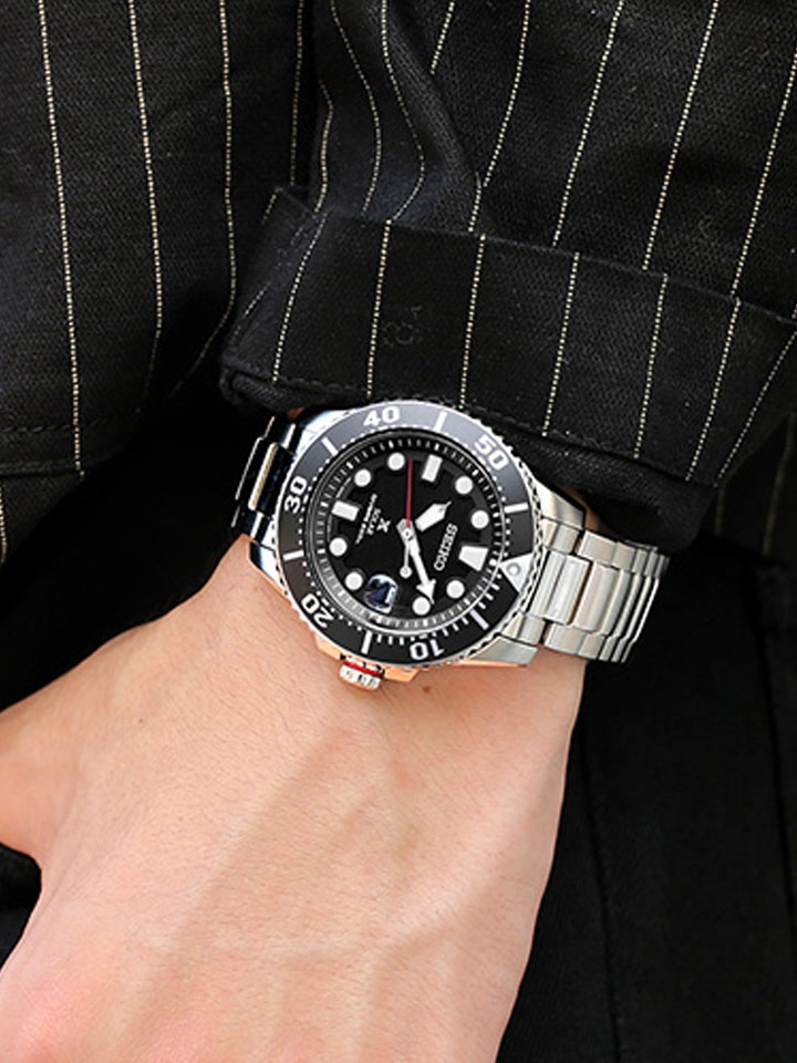 这款Seiko/精工手表,搭配一件黑色圆领条纹T恤,下装穿一条牛仔裤,脚踩一双撞色的运动鞋, 彰显都市商务男士的气质魅力。