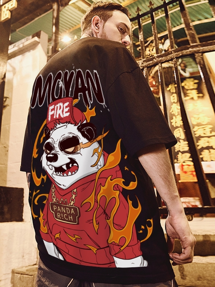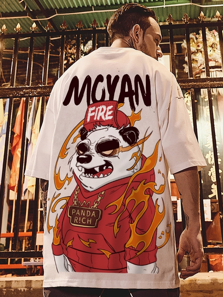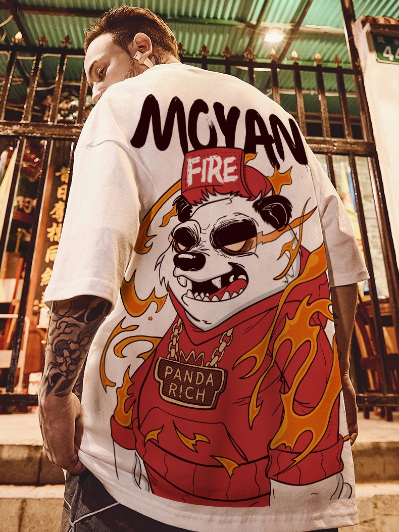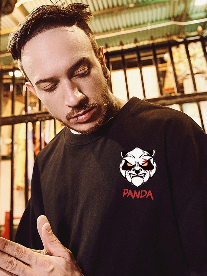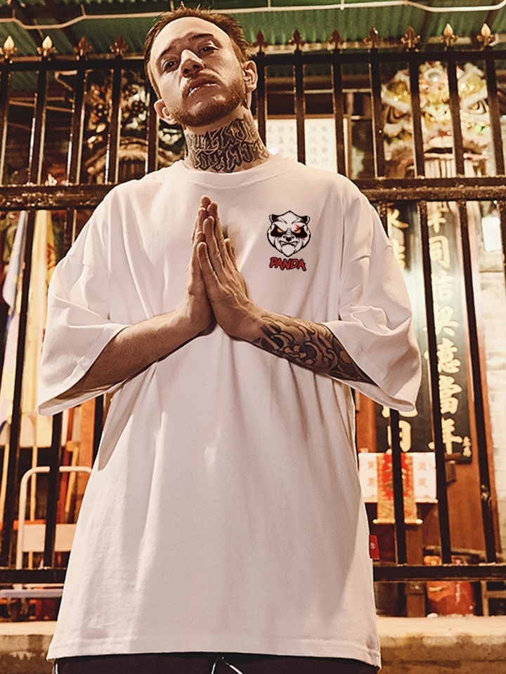 oversize设计的印花短袖,背后的熊猫印花让衣服充满了设计感,可谓是潮人所追求的时尚态度。搭配上也随心,下身工装裤,老爹鞋,整体更帅气。