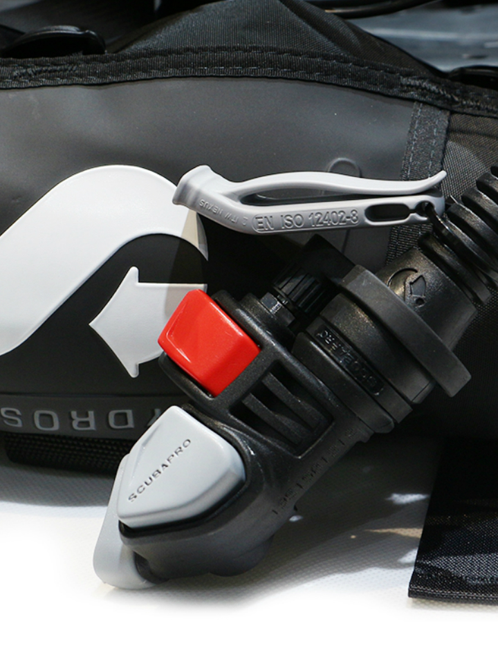 这款SCUBAPRO的潜水浮力控制器收纳包,后腰部的泄气阀主要是在身体形成水平姿态,夹克式BC并不完全贴合身体而形成上飘,腰部泄气阀高于肩部,气体会堆积在BC尾部和腰侧,此时需抬高身体右侧进行排气。
