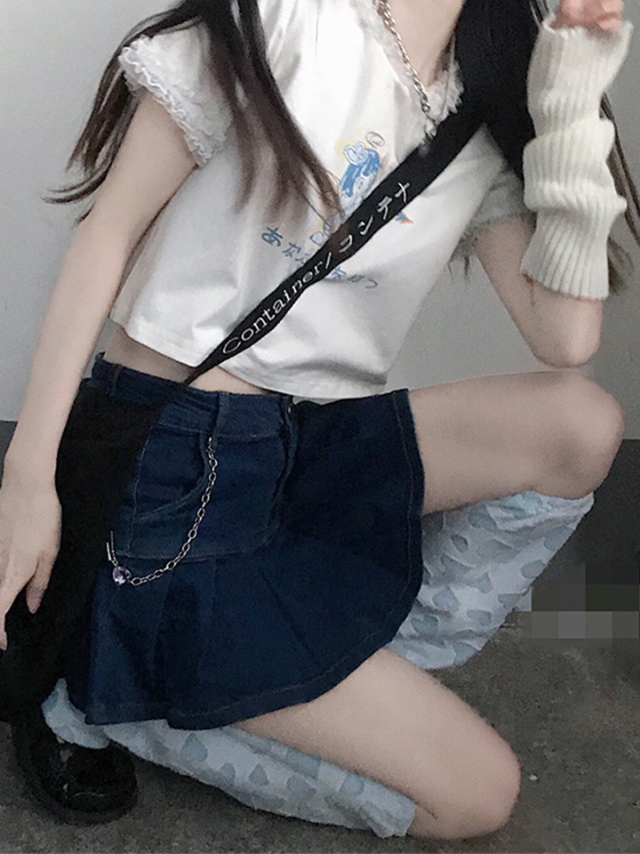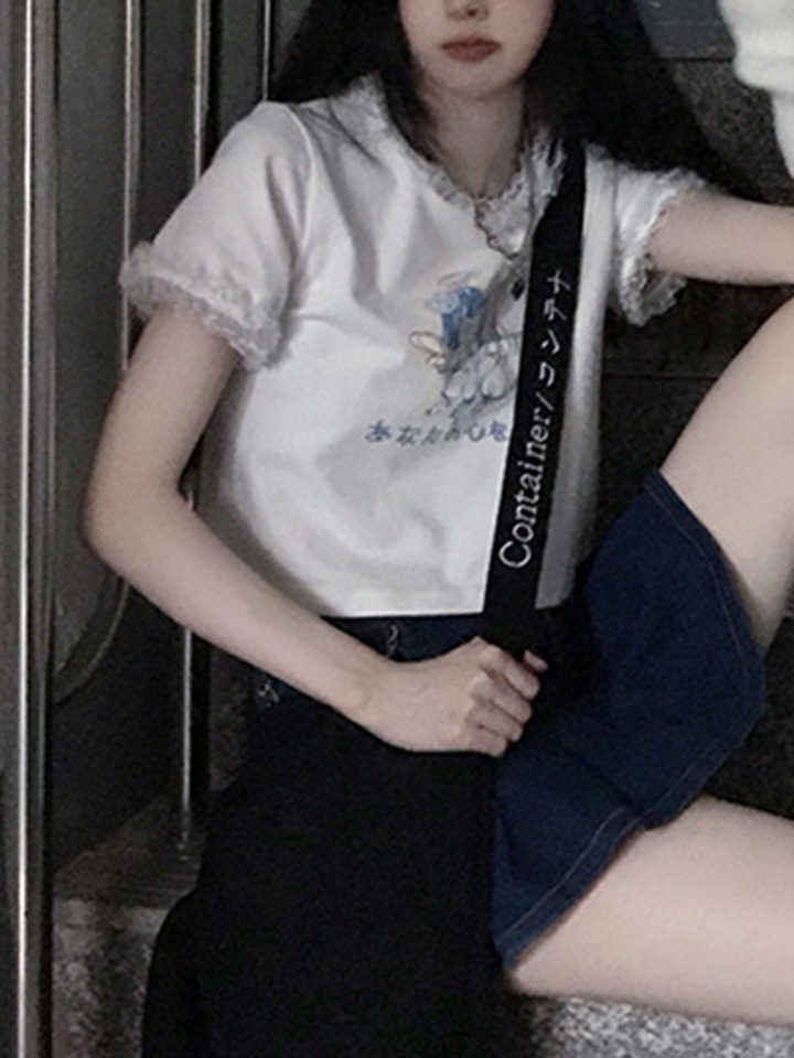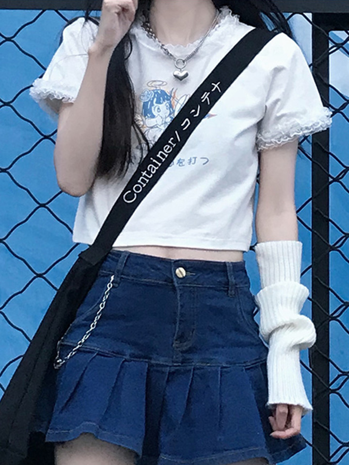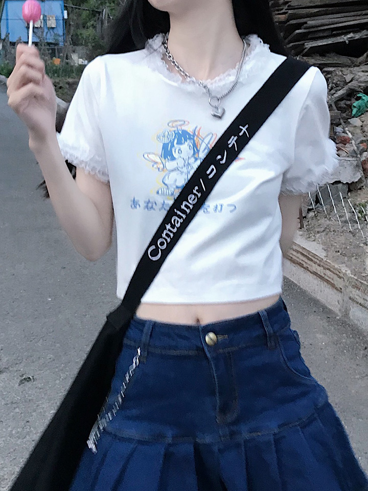 这款蕾丝花边的白色圆领上衣,下身可搭配件深蓝色的牛仔荷叶边短裙,再斜挎款黑色大包,青春亮眼,凸显了女性的甜美气质。