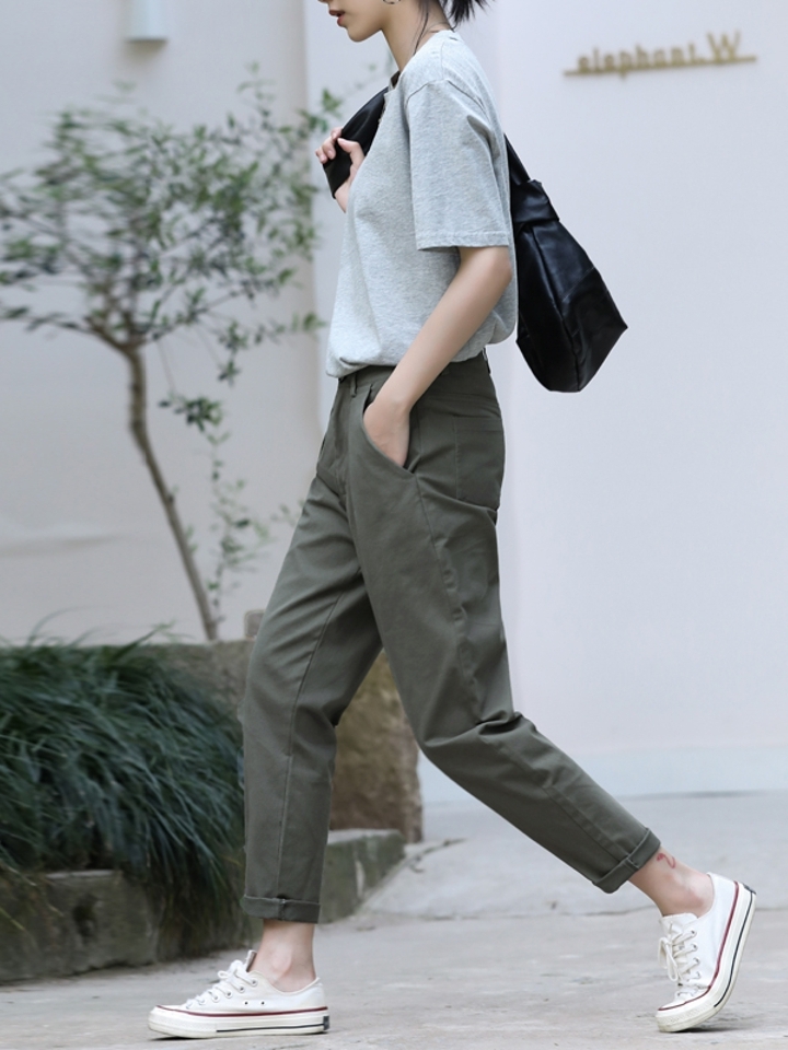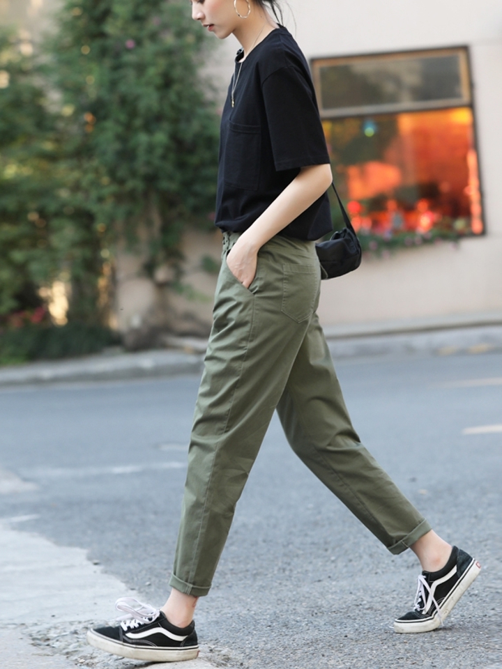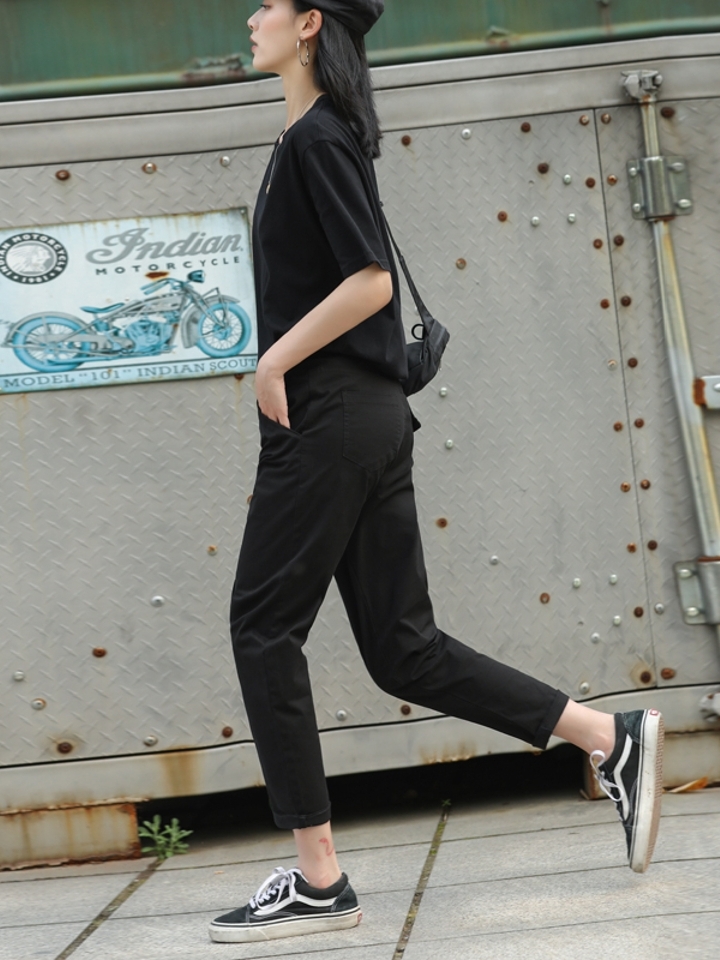 这条纯色系休闲裤利用硬朗挺括的面料裁剪而成,处以九分裤长,再把直筒的线条勾勒出微微哈伦的版型,着身尽显休闲大气。