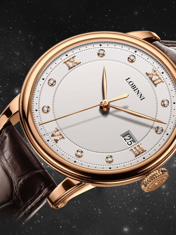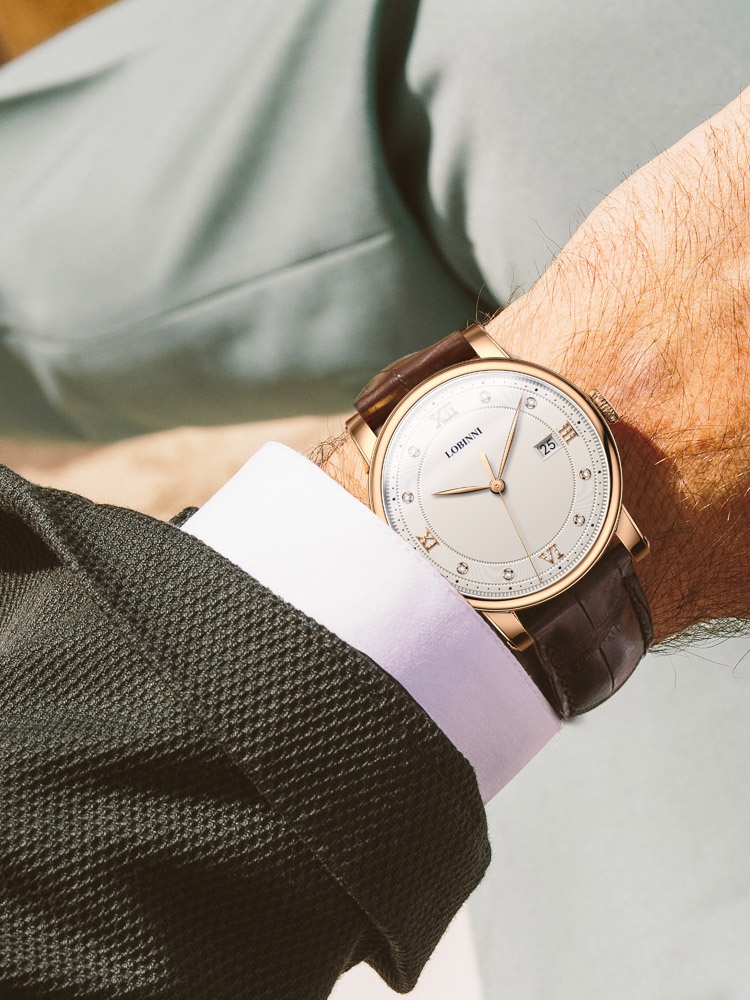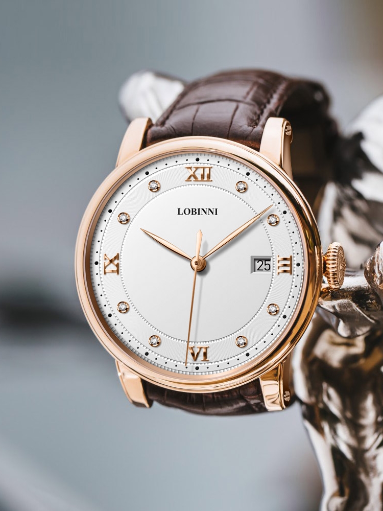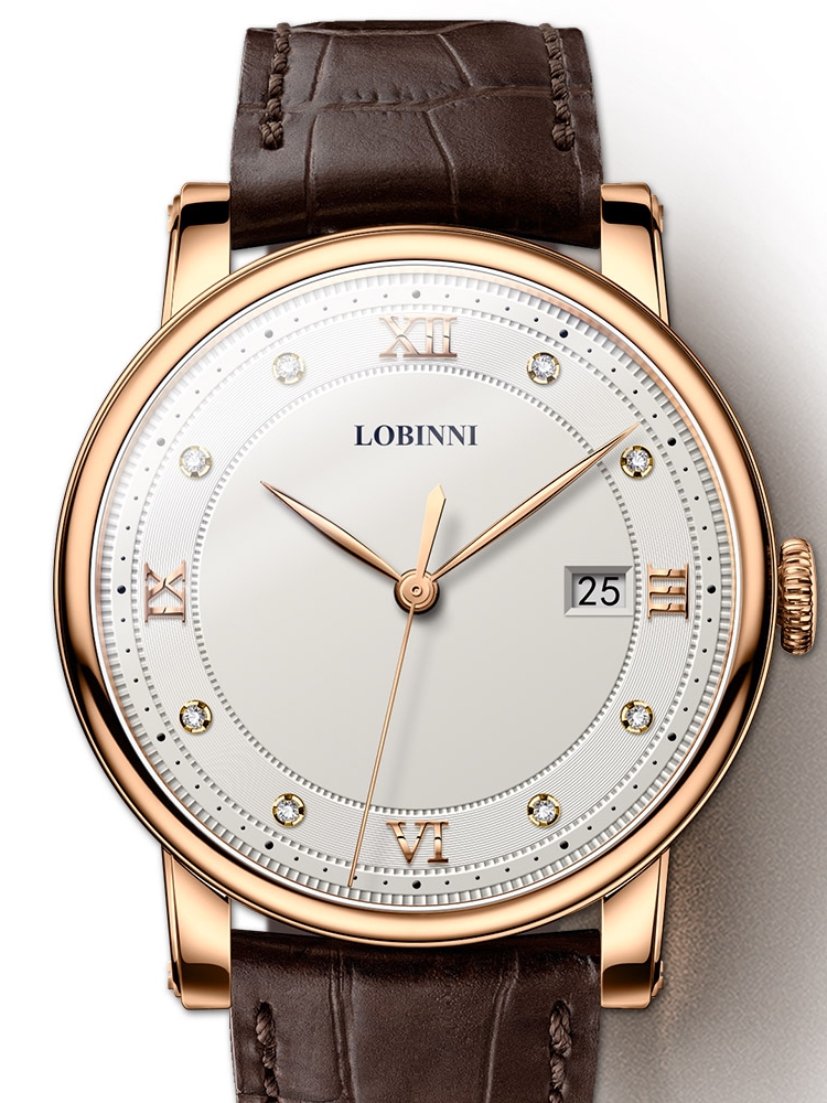 此款手表来自时尚名表品牌LOBINNI/罗宾尼,经典大三针设计,大气沉稳;时尚大表盘,十分适合商务人士佩戴;加入了日历功能视窗,提升实用性能;